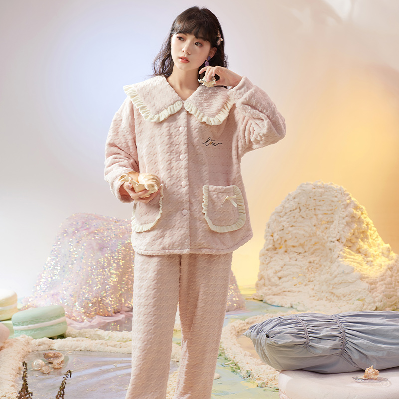 马克公主珊瑚绒睡衣女款冬季加绒加厚可爱公主风千鸟格冬天家居服