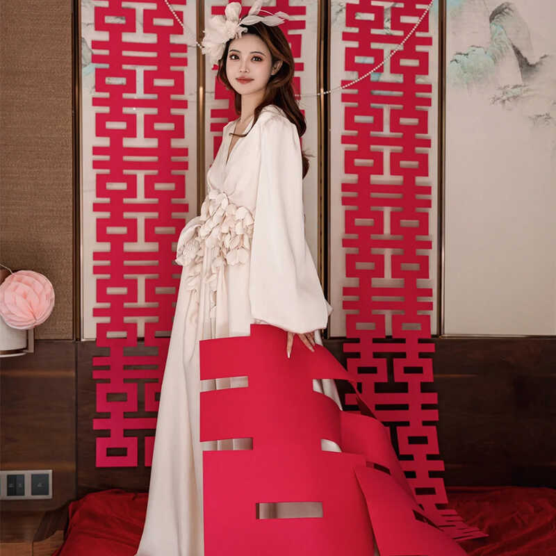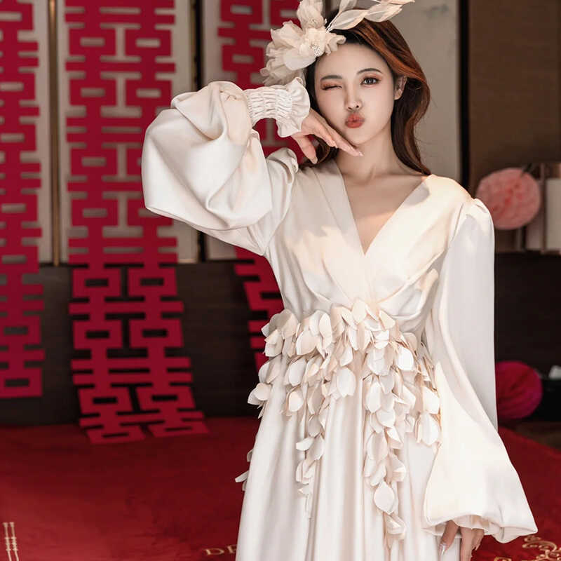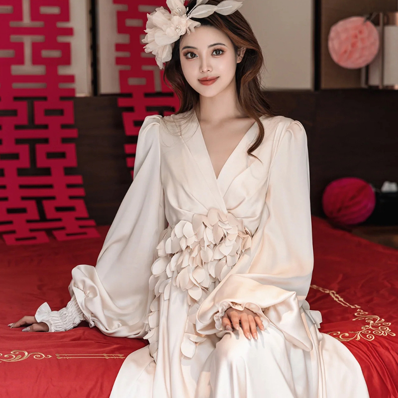高端新娘婚礼晨袍仙气白色复古收腰连衣裙精致轻纱浪漫穿搭爆款
