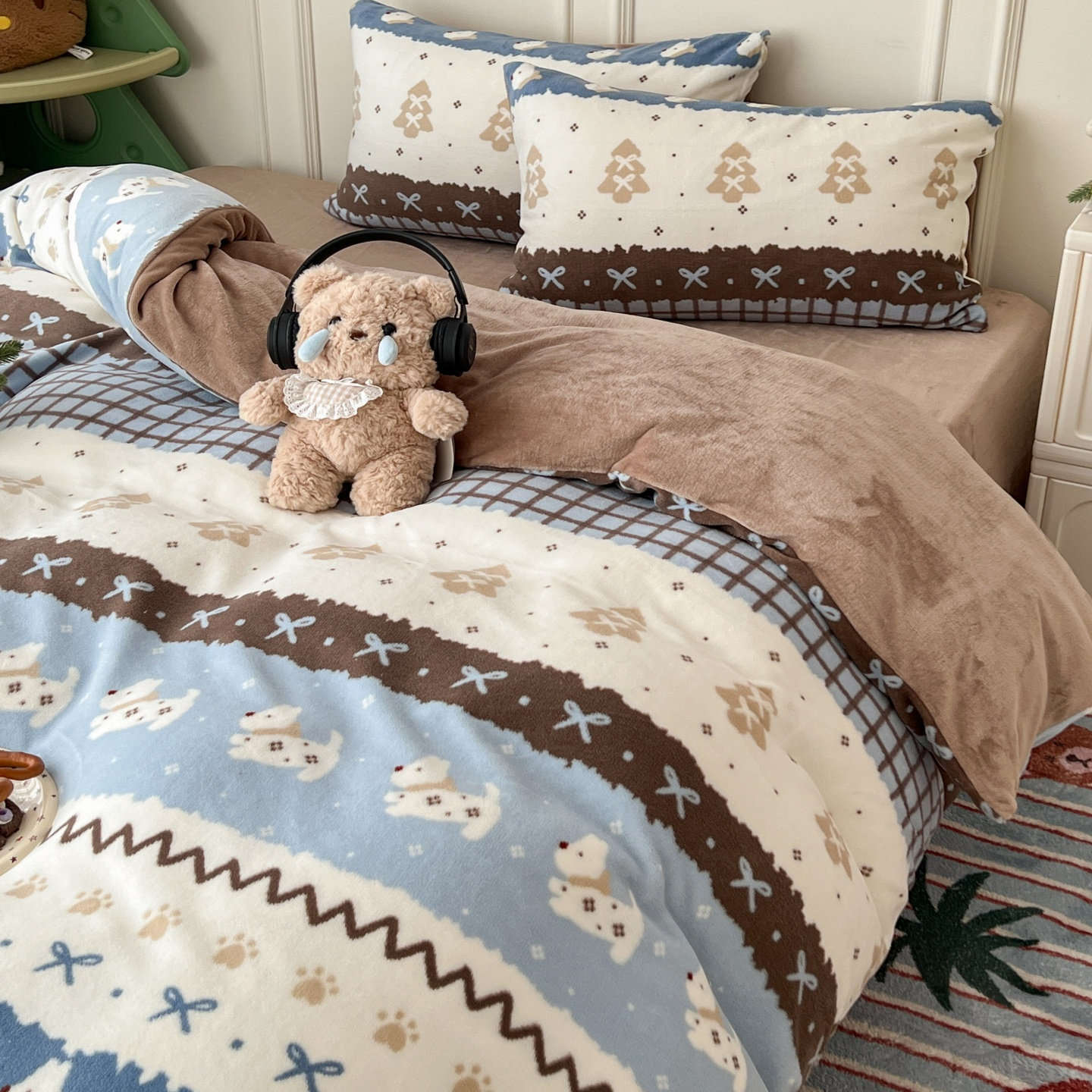 蓝色费尔岛秋冬保暖牛奶绒四件套卡通圣诞款珊瑚绒被套法兰绒床单