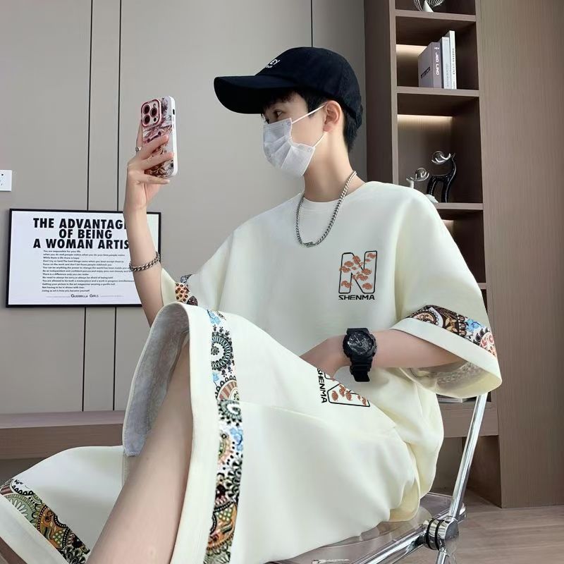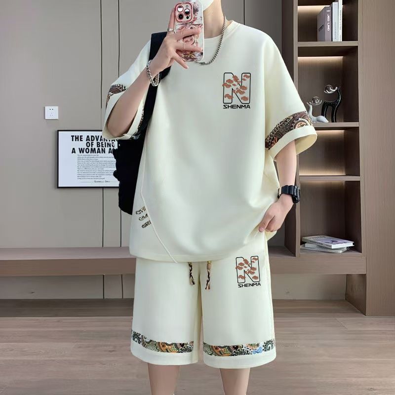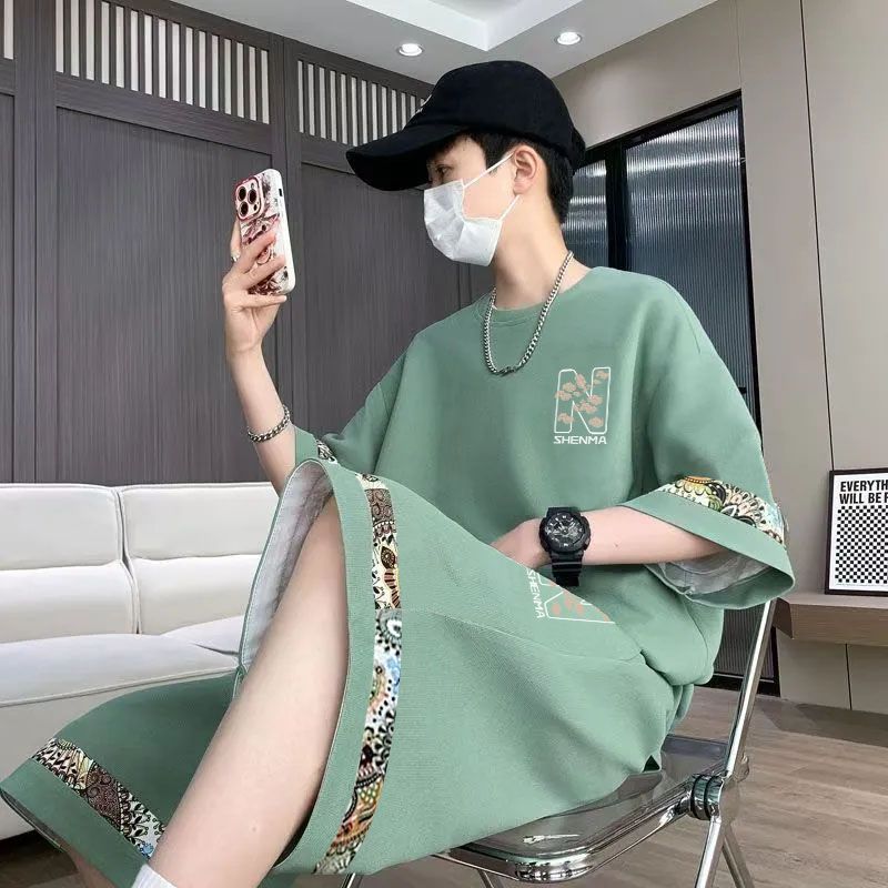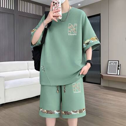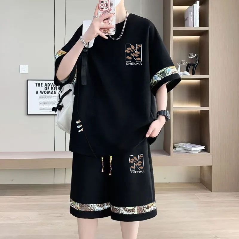 新款夏季套装国潮运动休闲宽松短袖短裤男士两件套学生帅气青少年