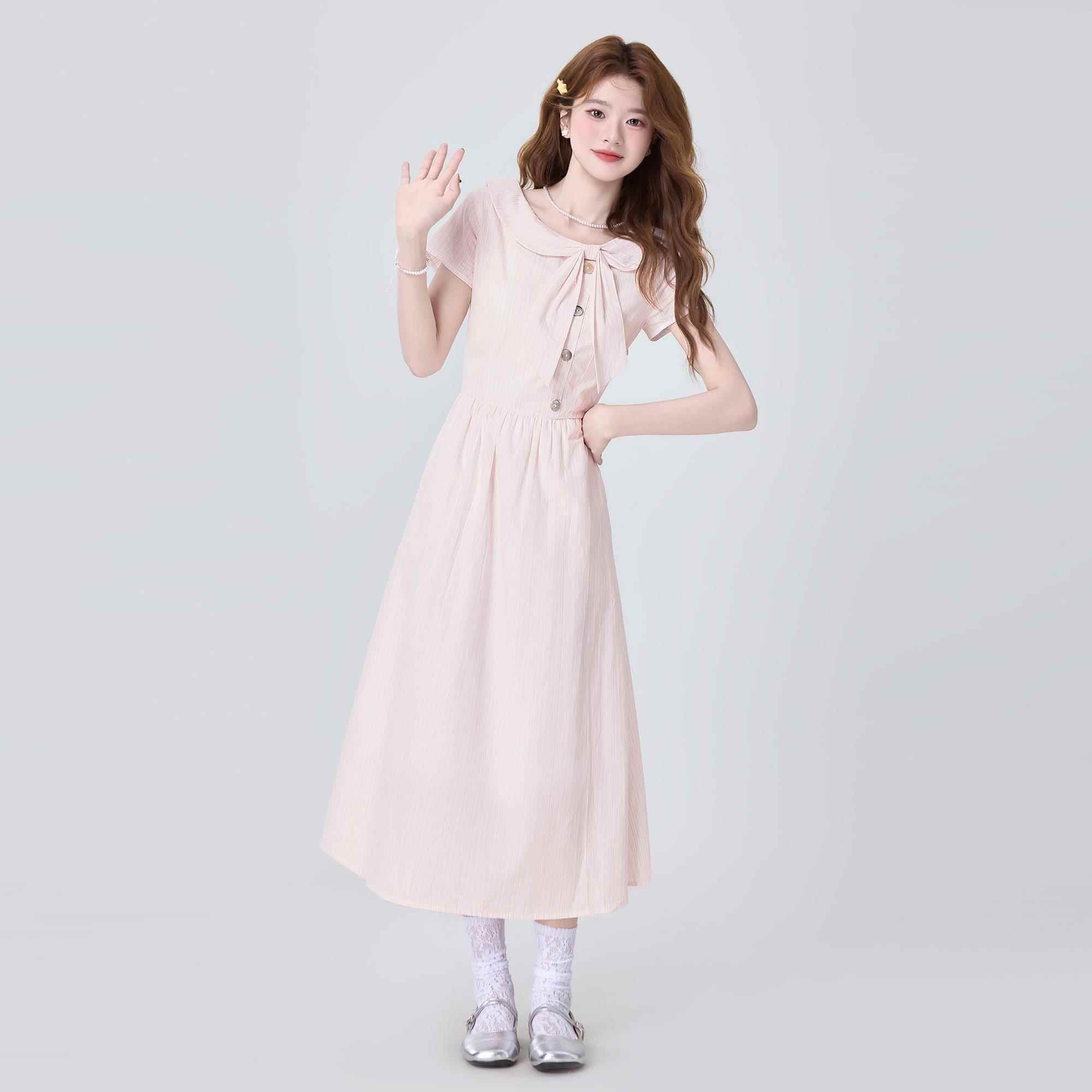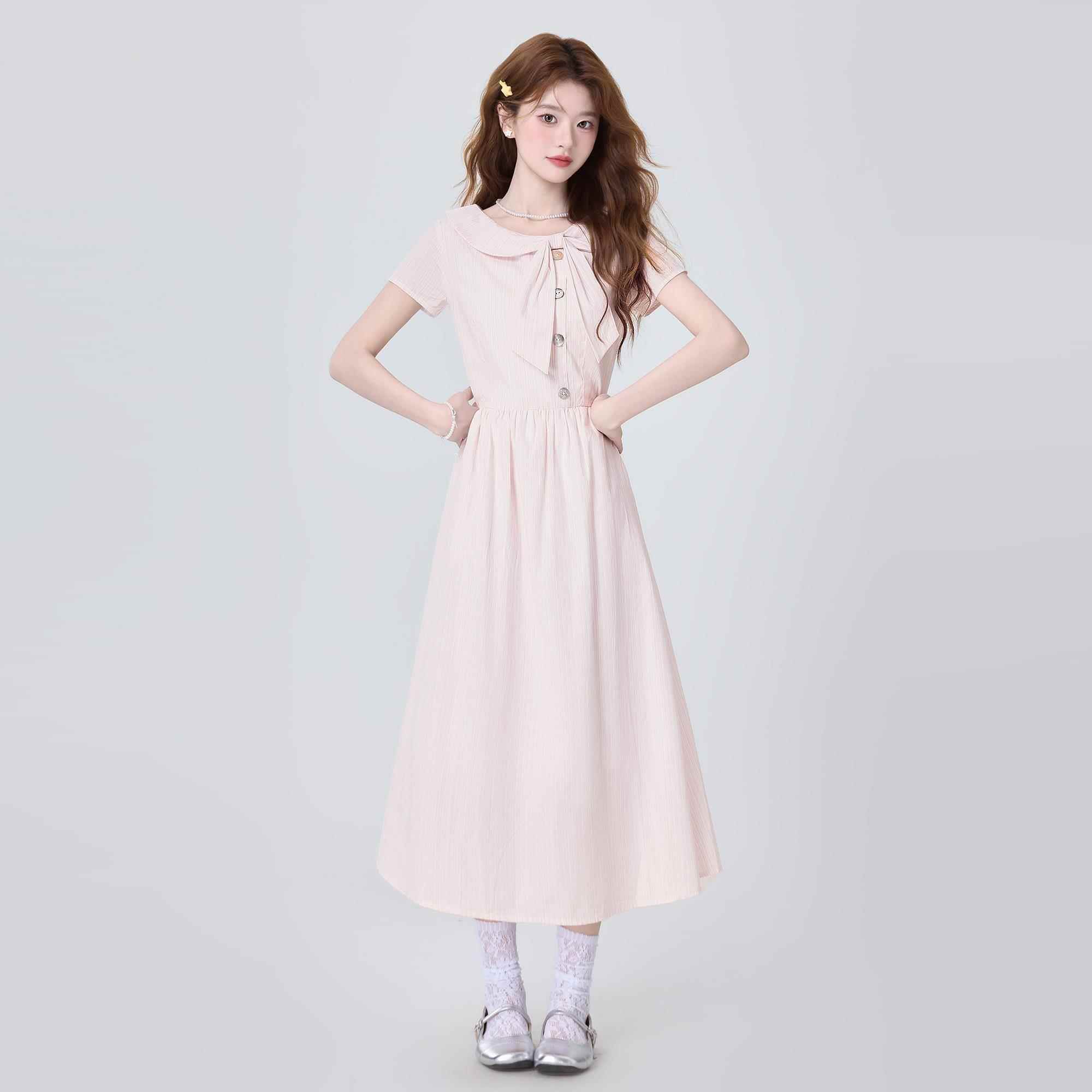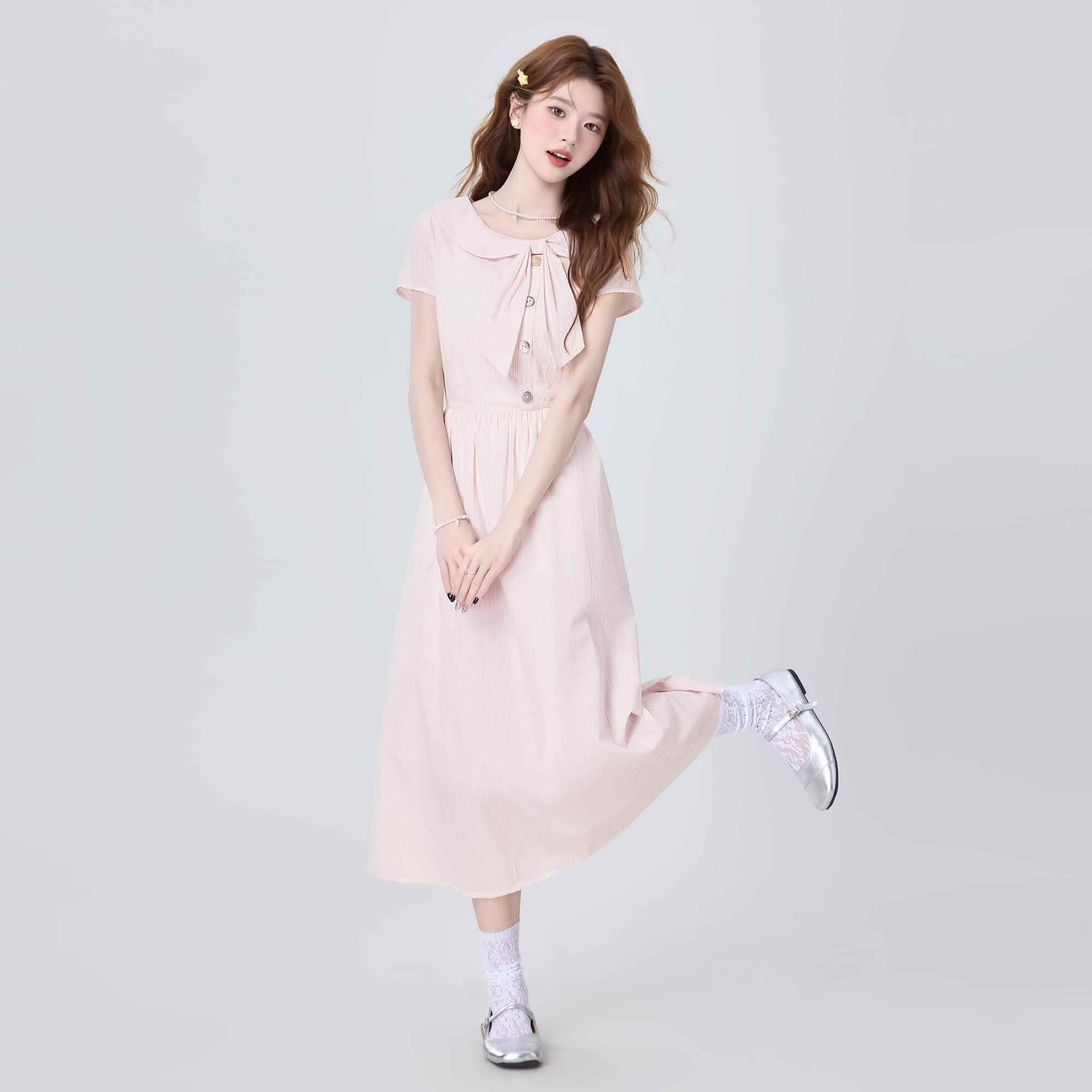 学院风粉色条纹蝴蝶结领子收腰洋装女2025夏温柔风掐腰显瘦长裙