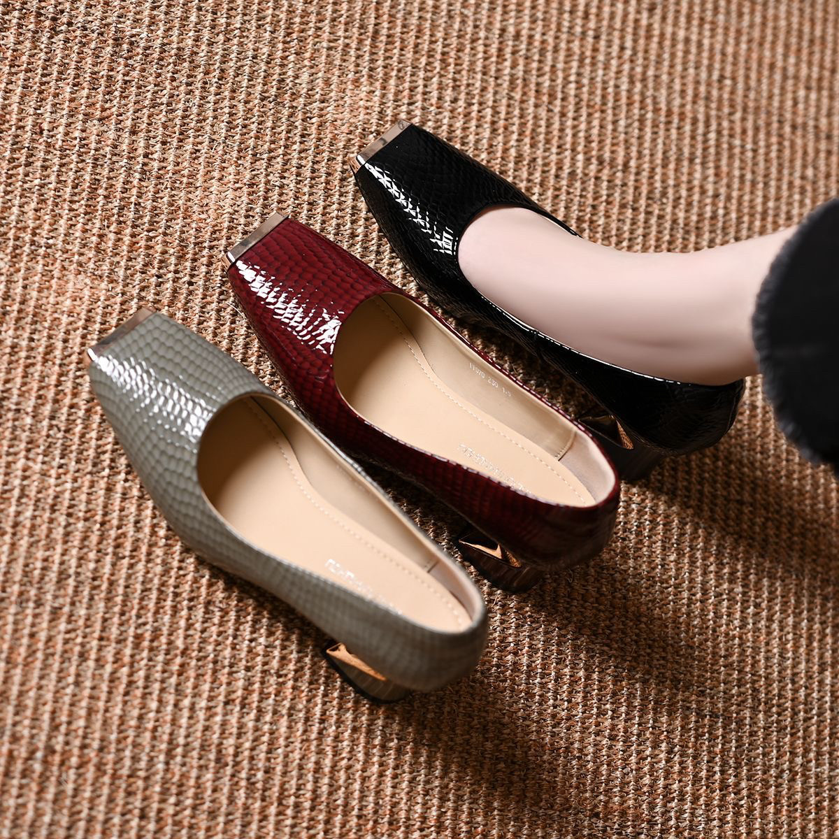 头层牛皮真皮方头女式浅口粗跟单鞋中跟鞋春秋时尚金属头百搭鞋子