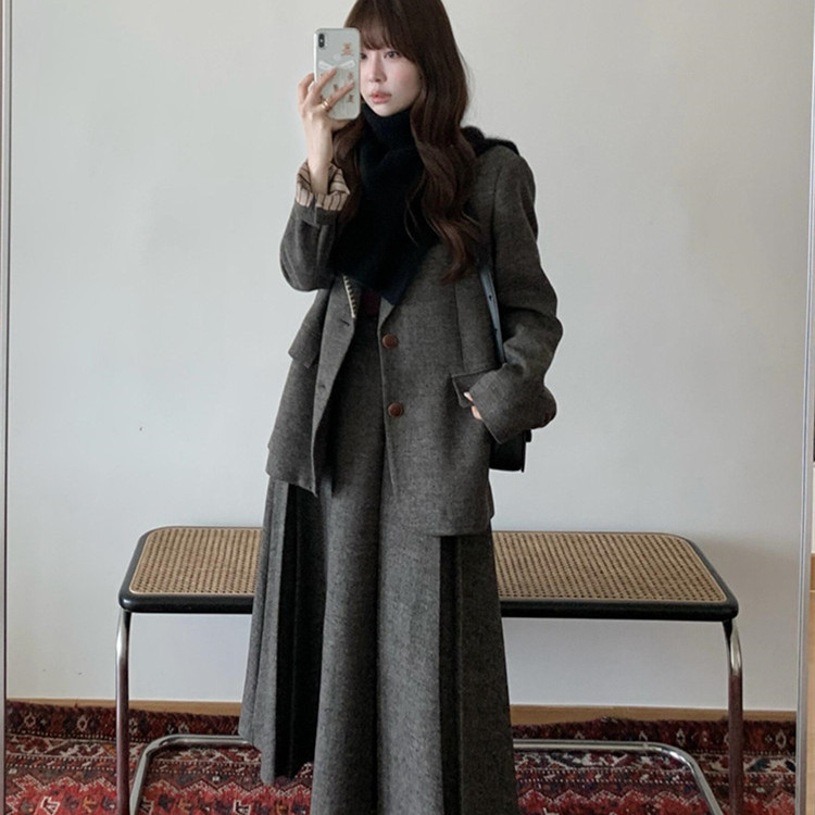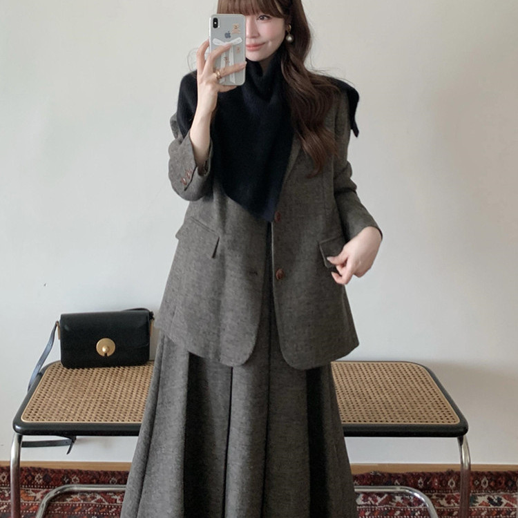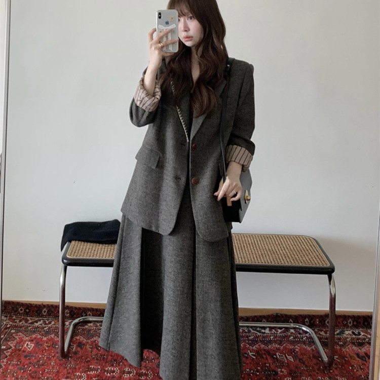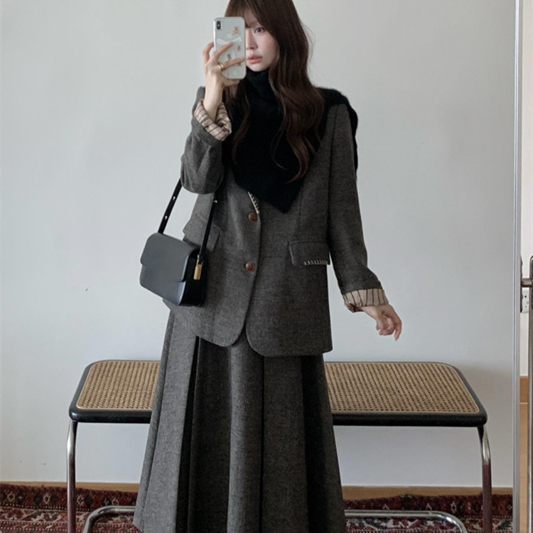 复古高级感灰色西装套装女秋季学院风西服外套百褶半身长裙两件套