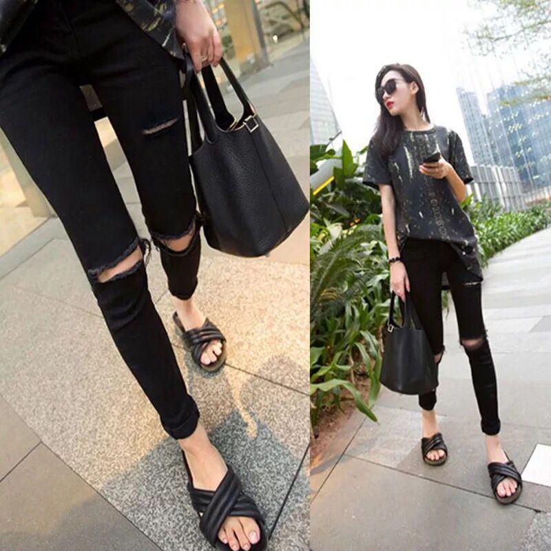 新款黑色八分烂牛仔裤女破洞乞丐裤潮韩版高腰弹力紧身显瘦小脚裤