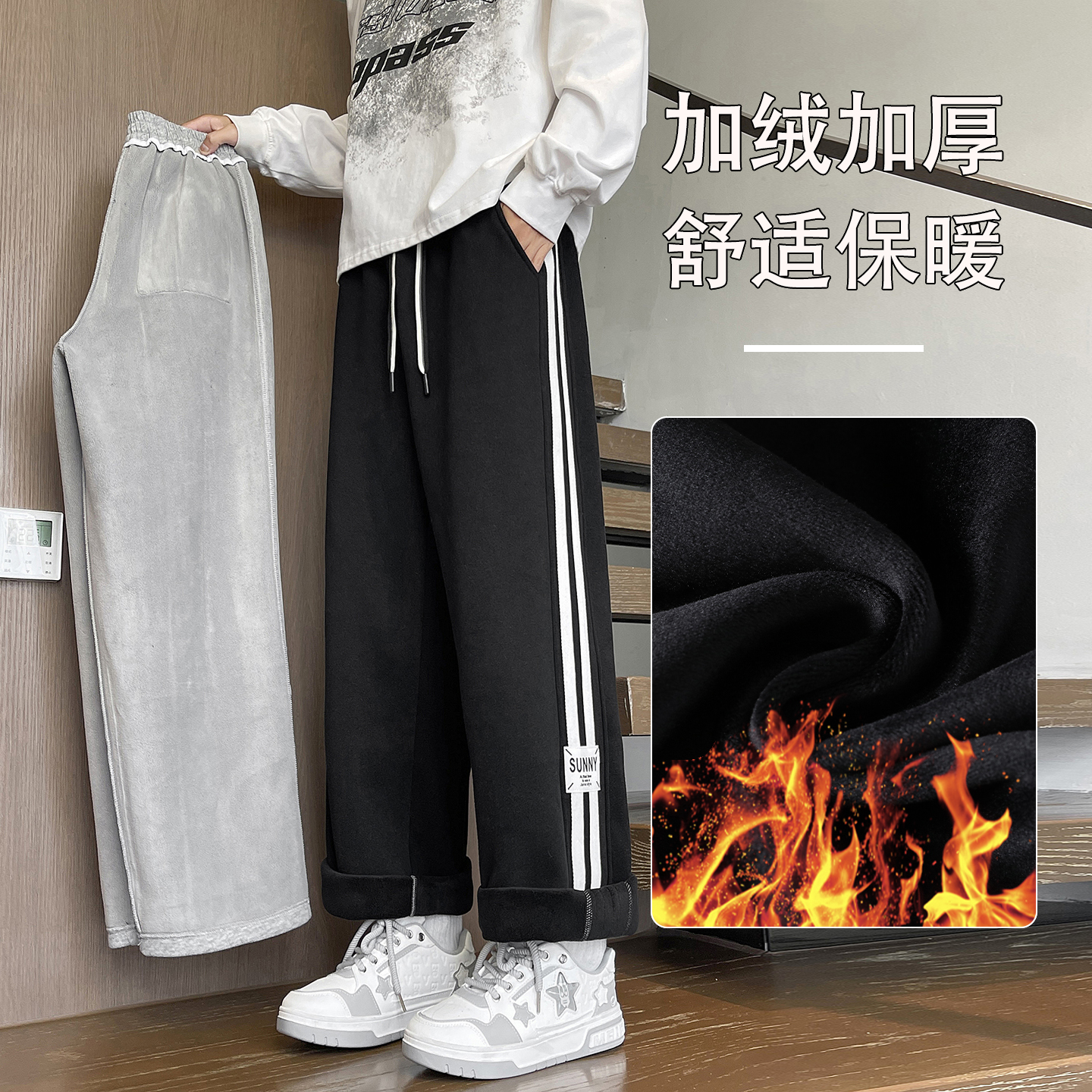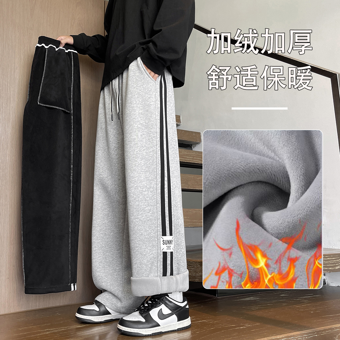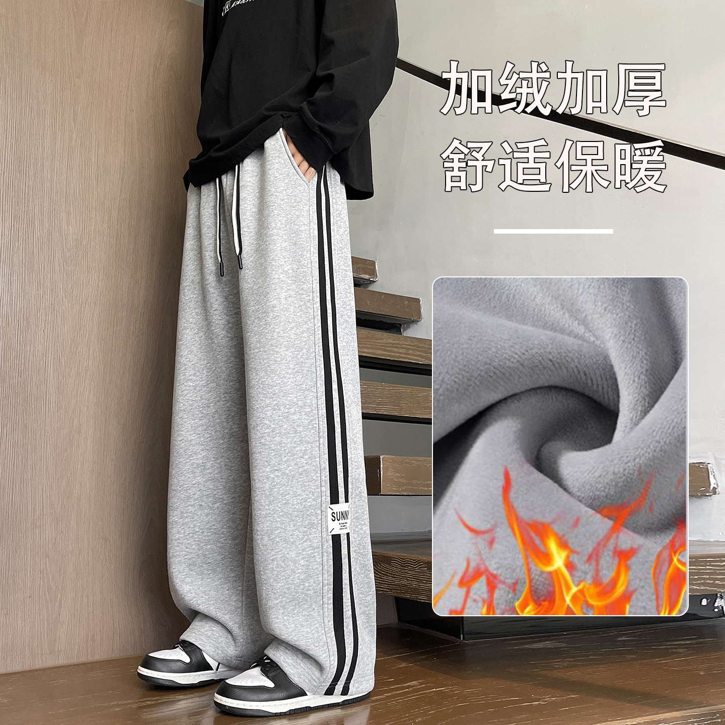 加绒加厚裤子冬季保暖直筒卫裤男款潮牌条纹拼接休闲运动长裤以純
