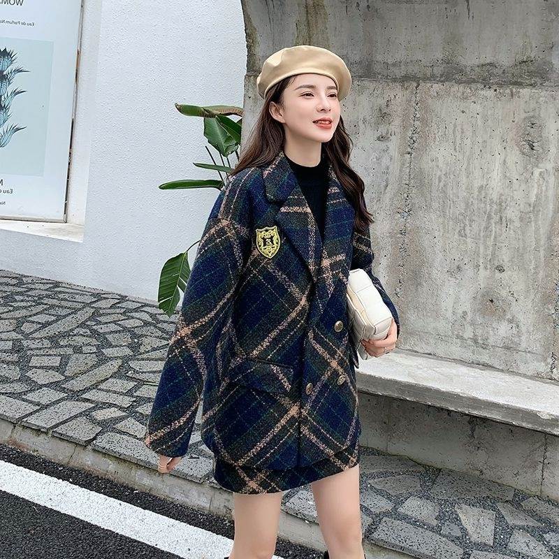 秋冬季新款小香风时尚格子粗花毛呢西装外套半身裙洋气两件套装女