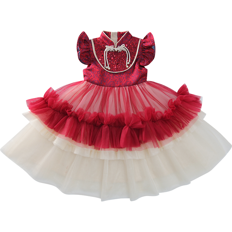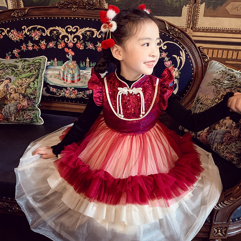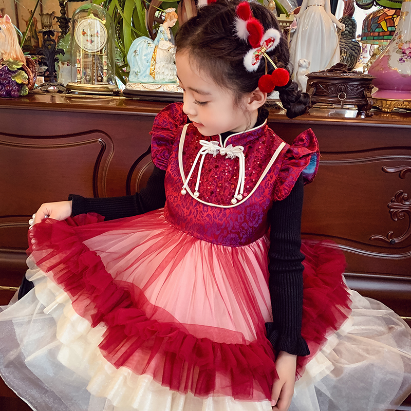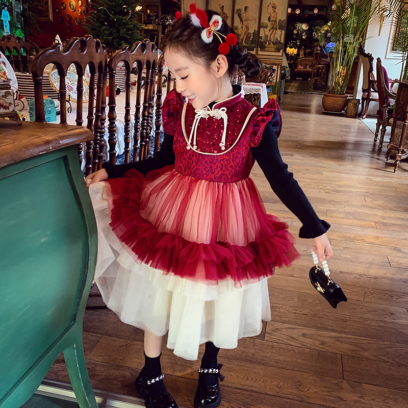 女童加绒连衣裙冬装新款洋气儿童国风新年装小女孩网纱公主裙