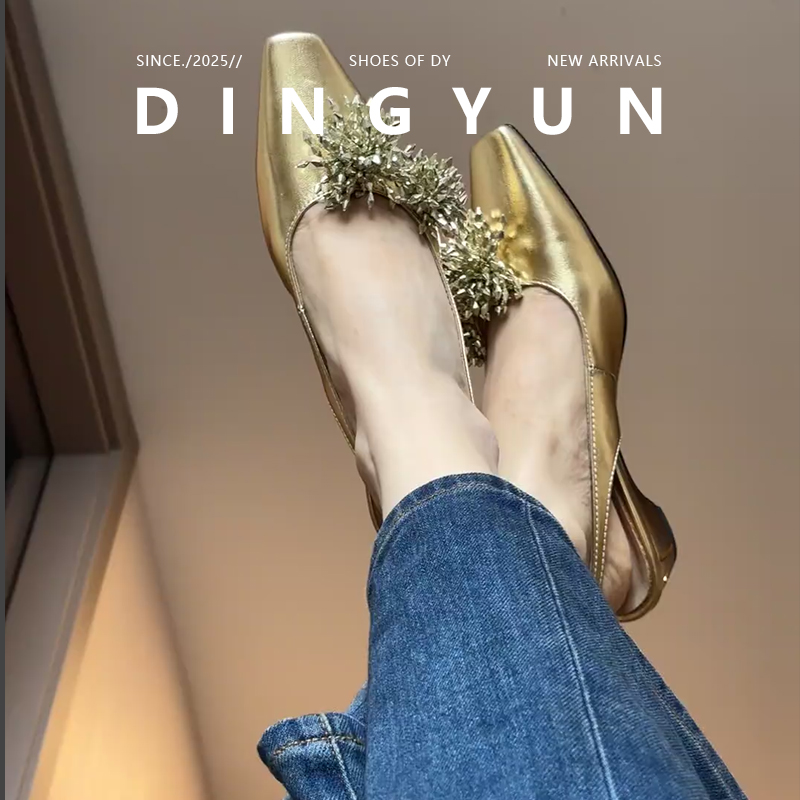羊皮版dingyun丁允高跟鞋金色婚鞋花朵烟花单鞋气质包头凉鞋粗跟