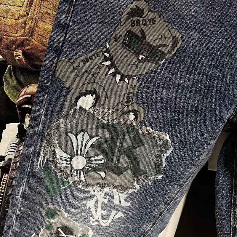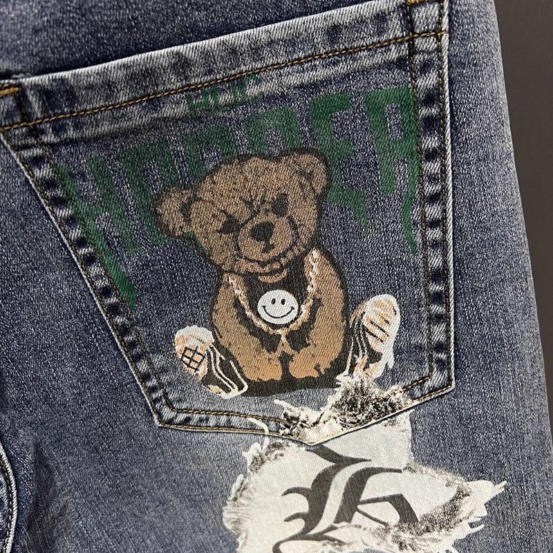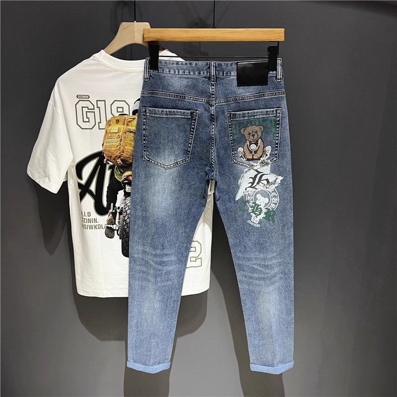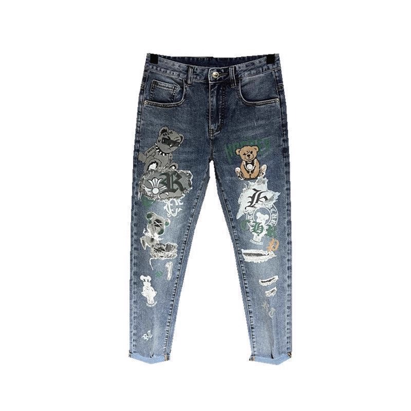夏季小熊印花牛仔裤男潮牌修身小脚裤网红破洞潮流帅气百搭九分裤