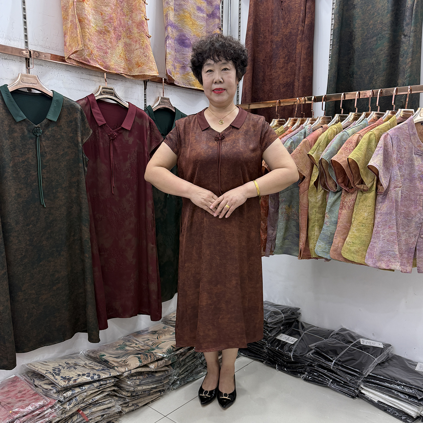 中老年妈妈夏季新款娃娃领真丝连衣裙短袖女洋气复古宽松大码女装