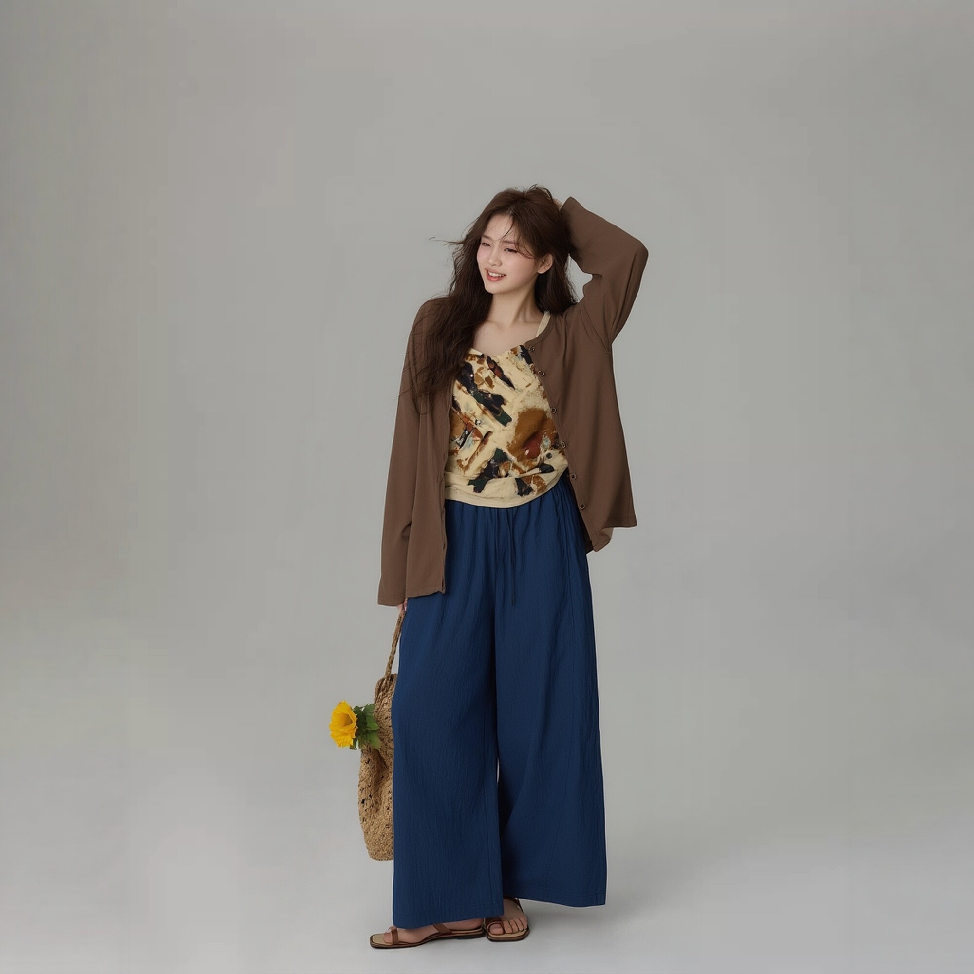 吊带大码胖mm遮肚子美拉德咖啡色系复古别致碎花小衫女装外穿内搭