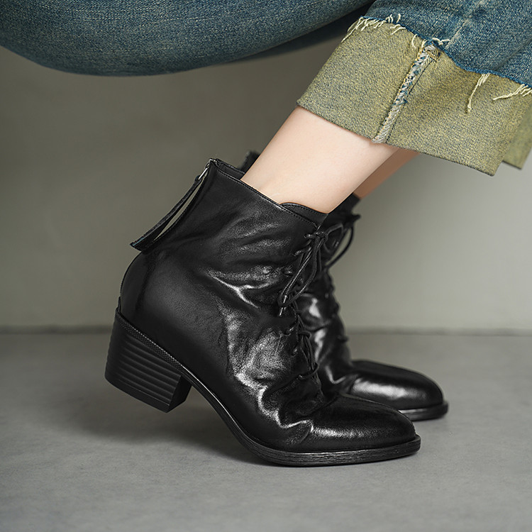 英伦风复古牛皮系带机车靴2025年方头粗跟高跟侧拉链短筒靴女
