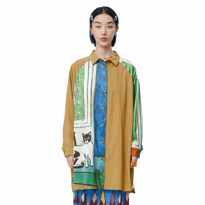 MOVEUP幻走2025春季新款.FUN系列印花高开叉侧骨设计中长款衬衫女