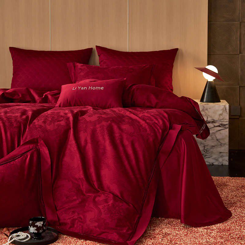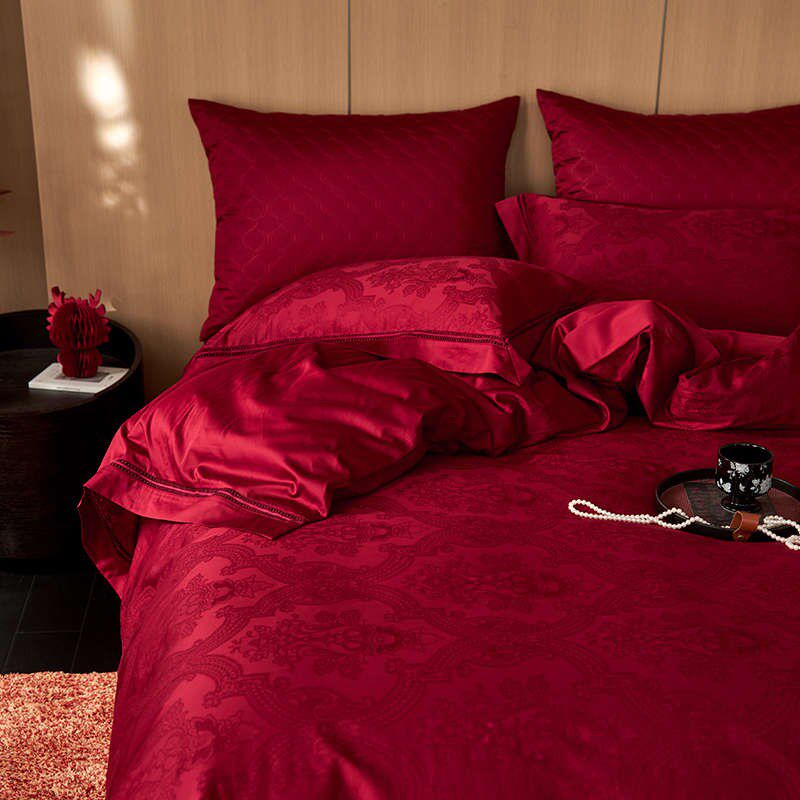 高奢风~100Sj婚庆大红色全棉长绒棉提花结婚四件套纯棉被套床单款