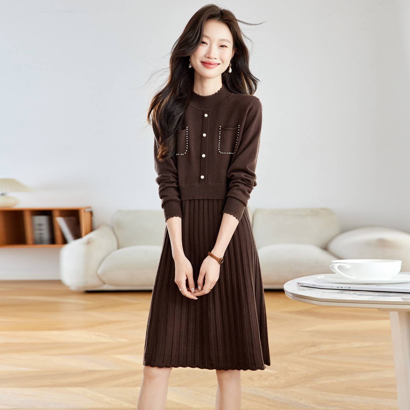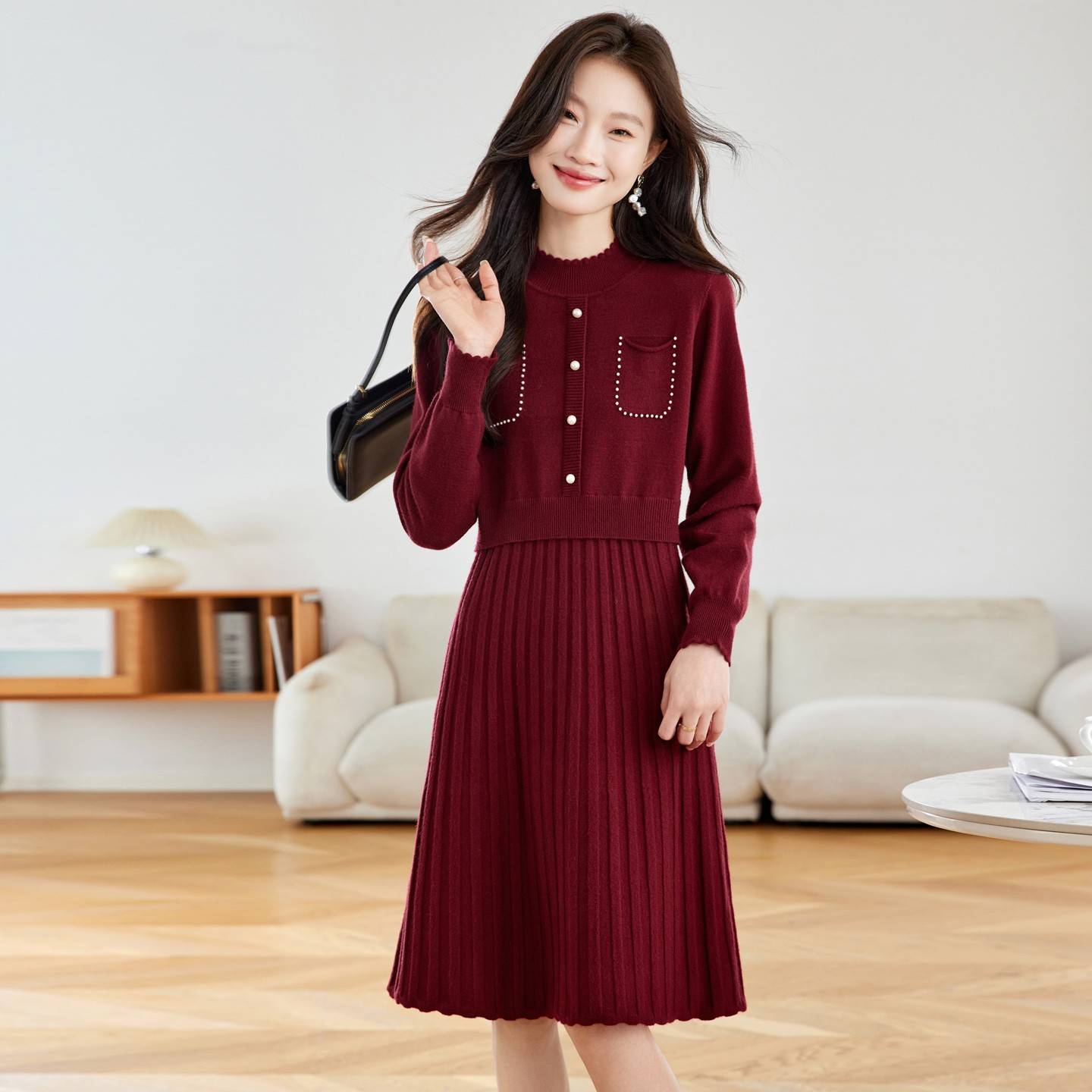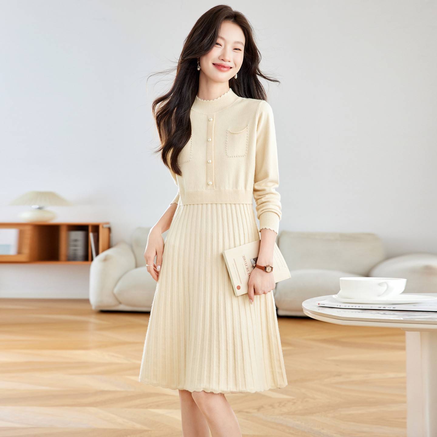 小香风针织连衣裙秋冬2025爆款收腰百褶裙配大衣中长款打底毛衣裙