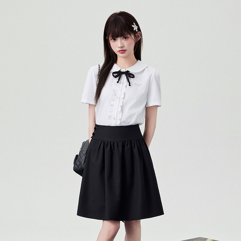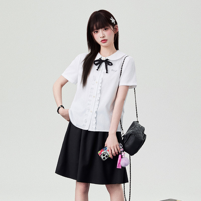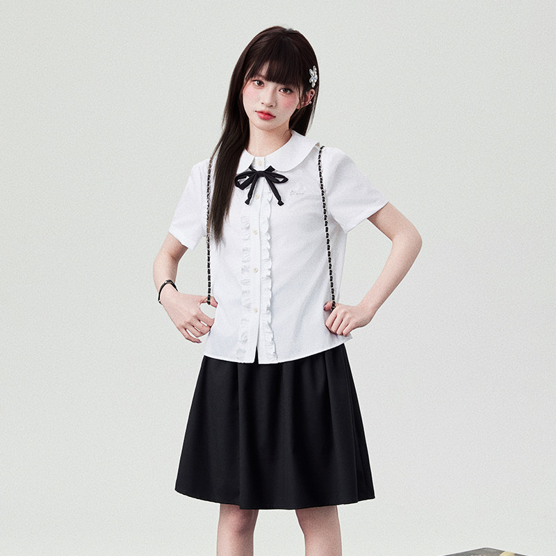 花铃太太jk春款娃娃领木耳边门襟宽松衬衫白色甜美学院风短袖套装