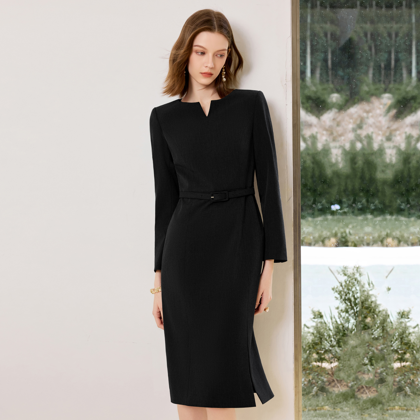 AD黑色气质连衣裙女2025新款秋冬中长款职业工作服开叉西装裙中长