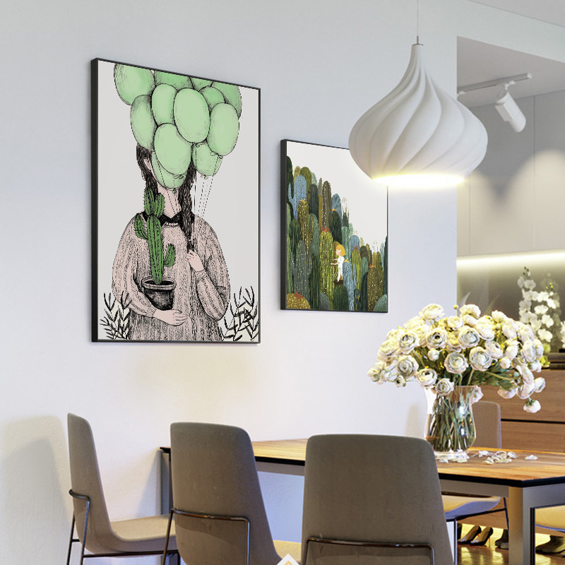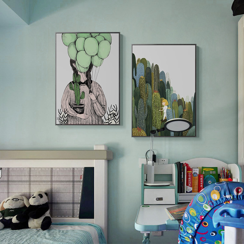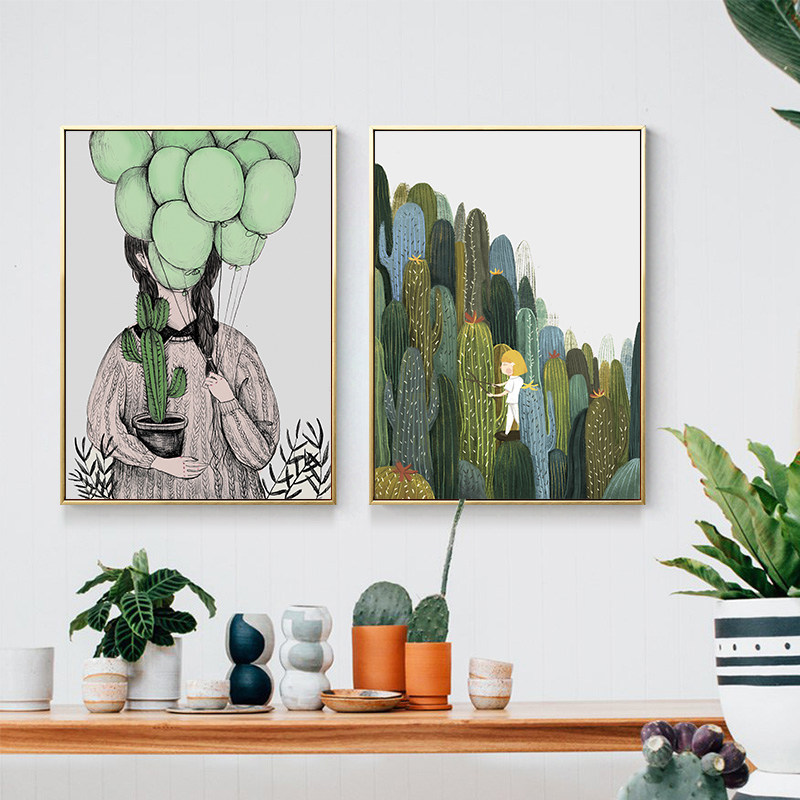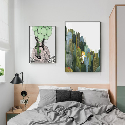 北欧小清新田园抽象仙人掌绿色植物装饰画搭配卧室浅蓝墙面壁挂画