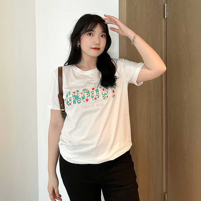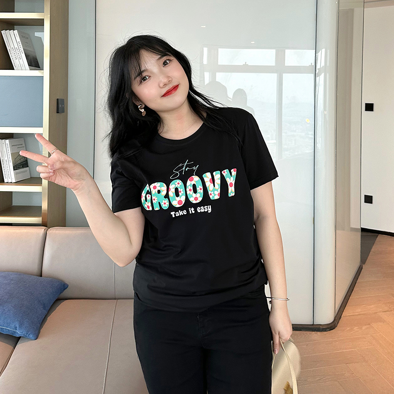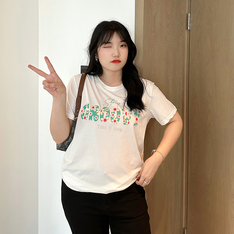 步步红大码女装夏季休闲短袖T恤女胖mm圆领薄款宽松简约印花半袖