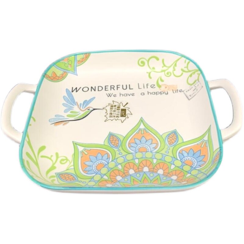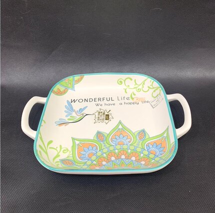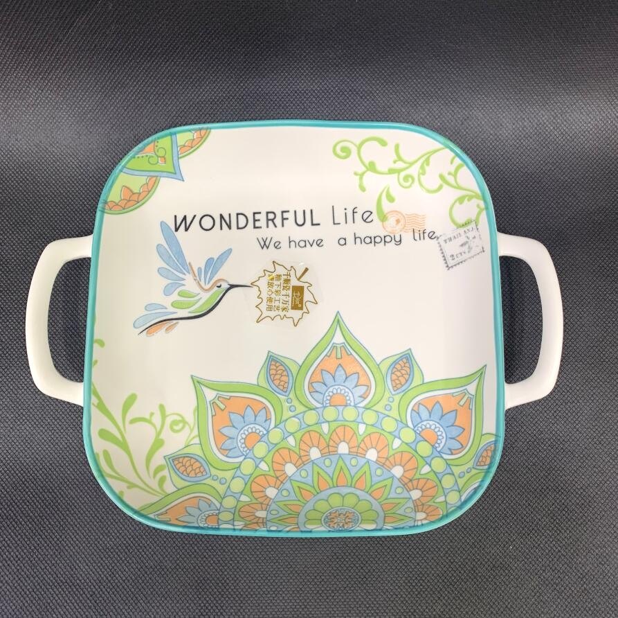 皇冠正品千顺曼陀罗釉下彩9寸双耳正方盘水果盘点心盘子寿司盘瓷