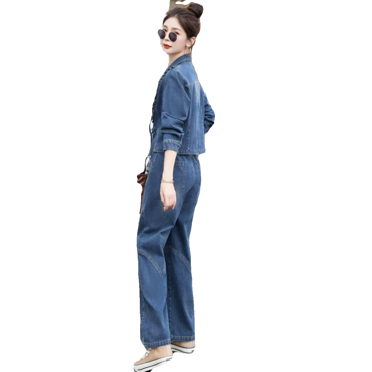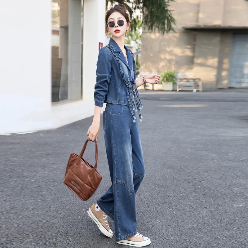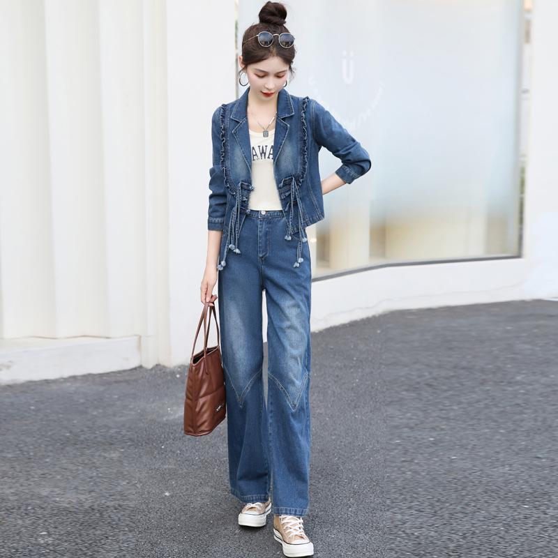 牛仔阔腿裤套装女2024春秋新款时尚休闲减龄显瘦短外套洋气两件套