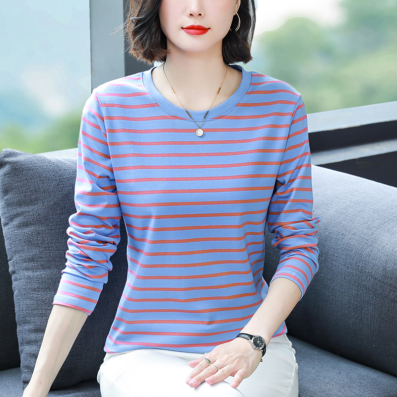 春秋衣女外穿长袖t恤女大码宽松遮肚中年妈妈纯棉打底衫上衣条纹