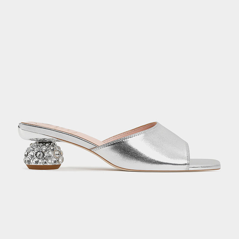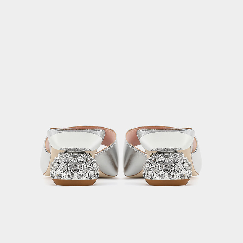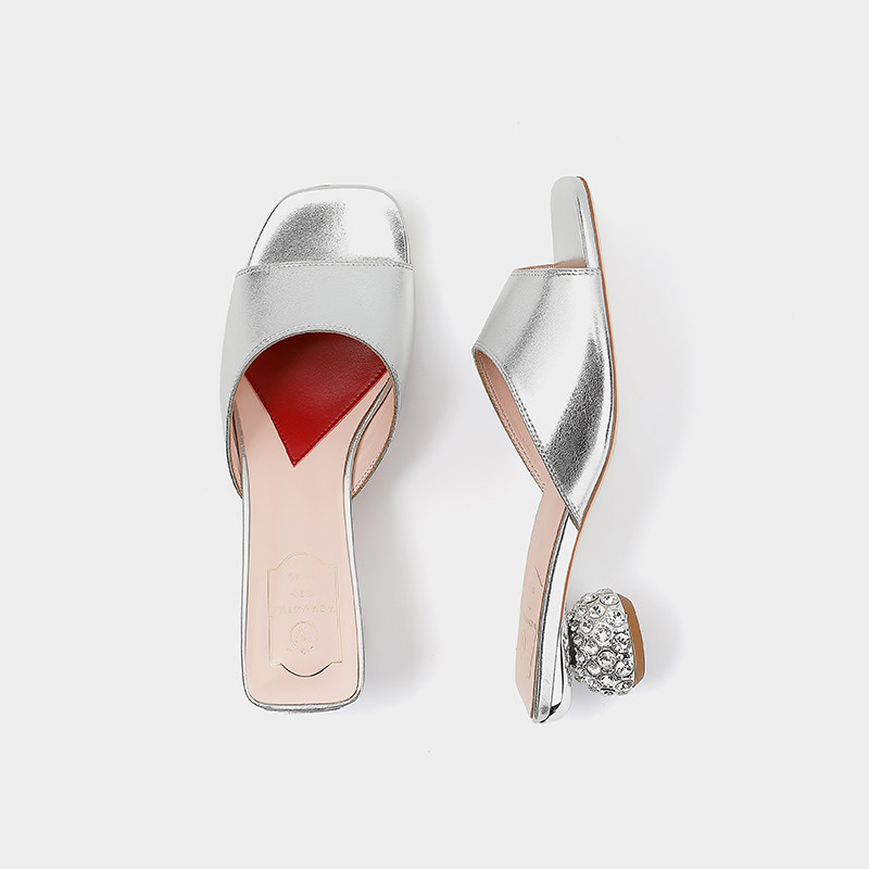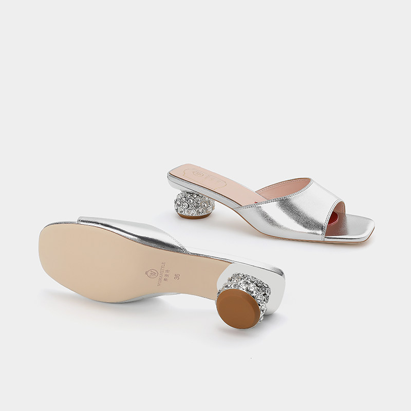 2025新款法式小方头水钻跟一字高跟拖鞋女法式真皮外穿露趾凉拖鞋