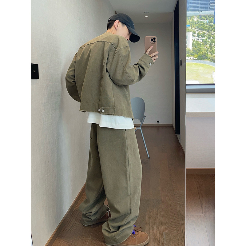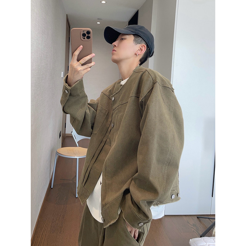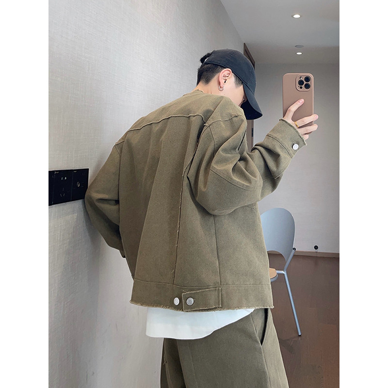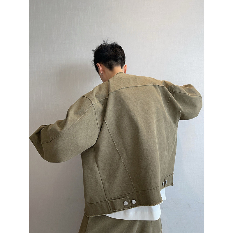 dannyandzee秋冬复古重水洗毛边军绿色做旧工装夹克外套男