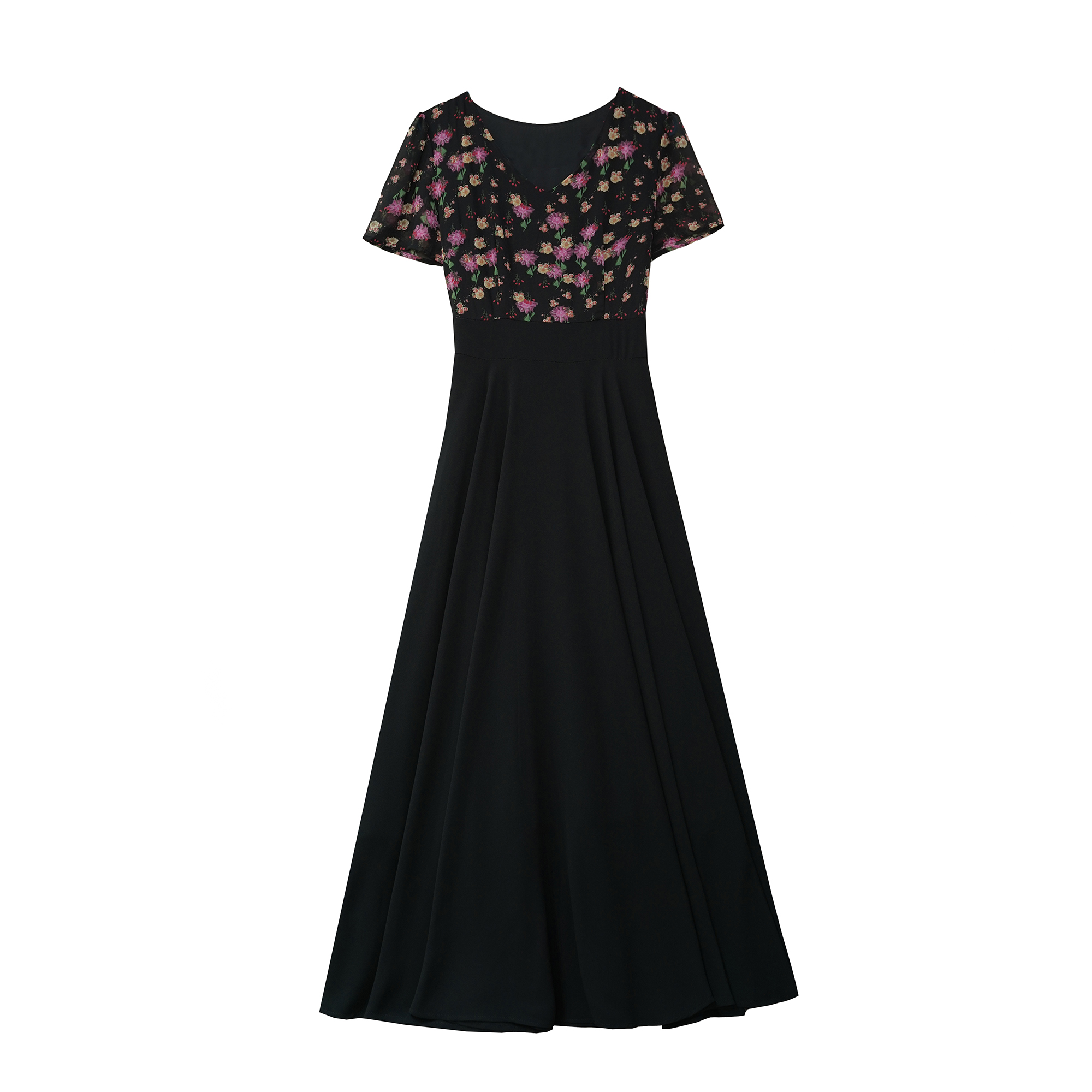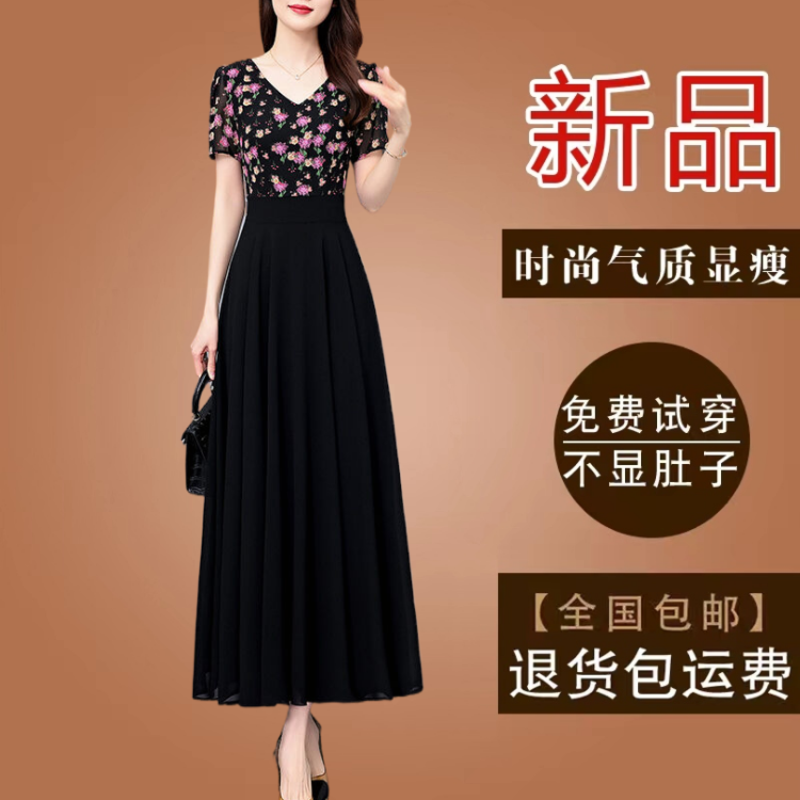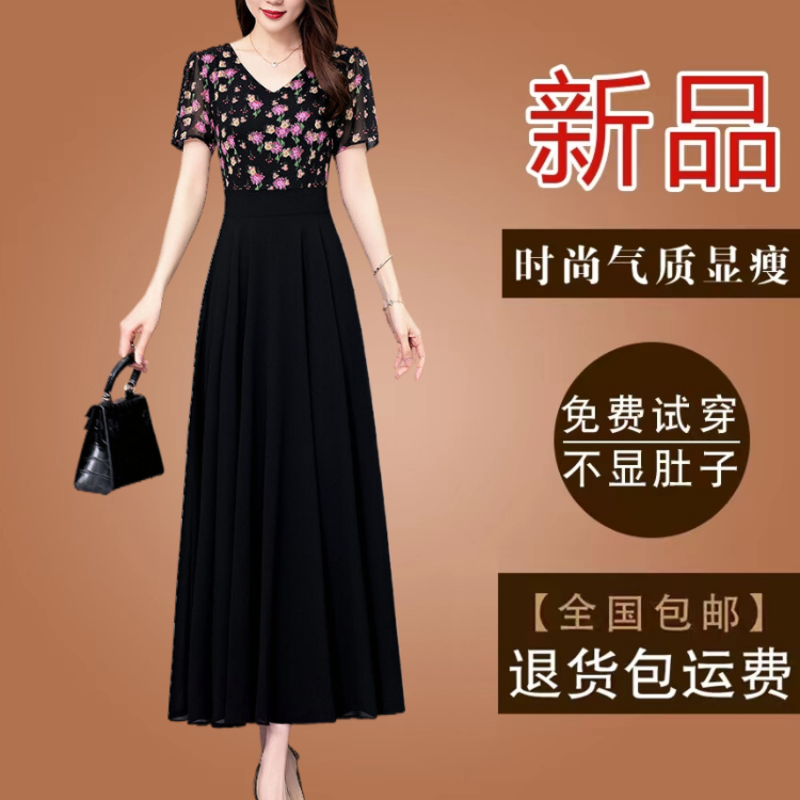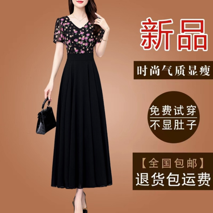 高档妈妈款假两件真丝雪纺碎花连衣裙2025夏季短袖修身减龄长裙女