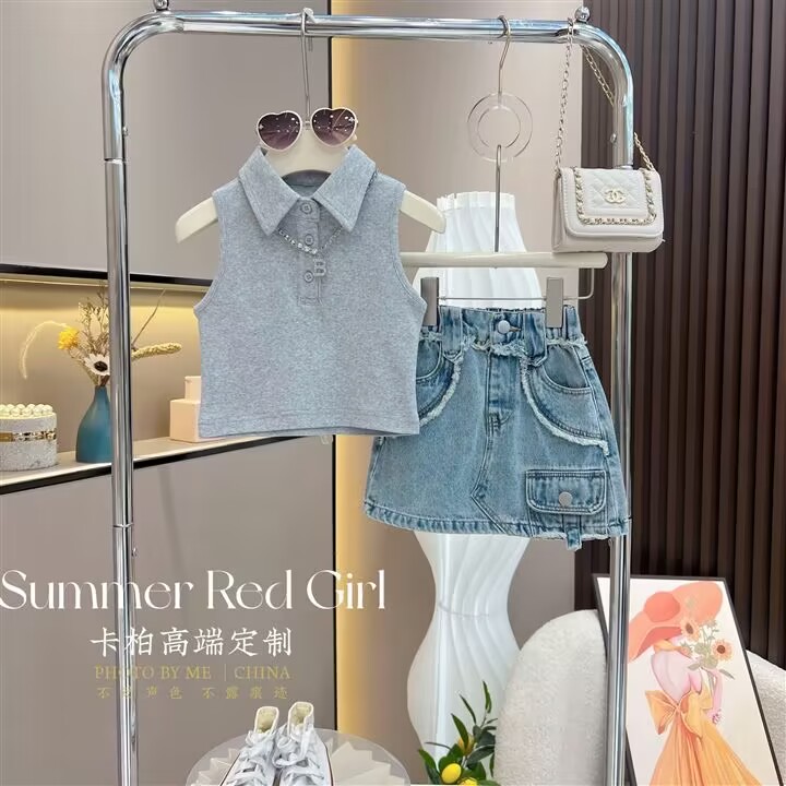 女童套装夏装新款2025儿童洋气韩版宽松无袖POLO衫牛仔短裙两件套