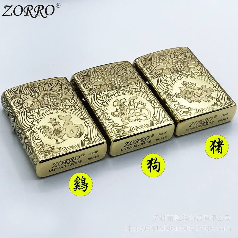 ZORRO黄铜十二生肖煤油火机五面精雕个性翻盖防风砂轮佐罗打火机