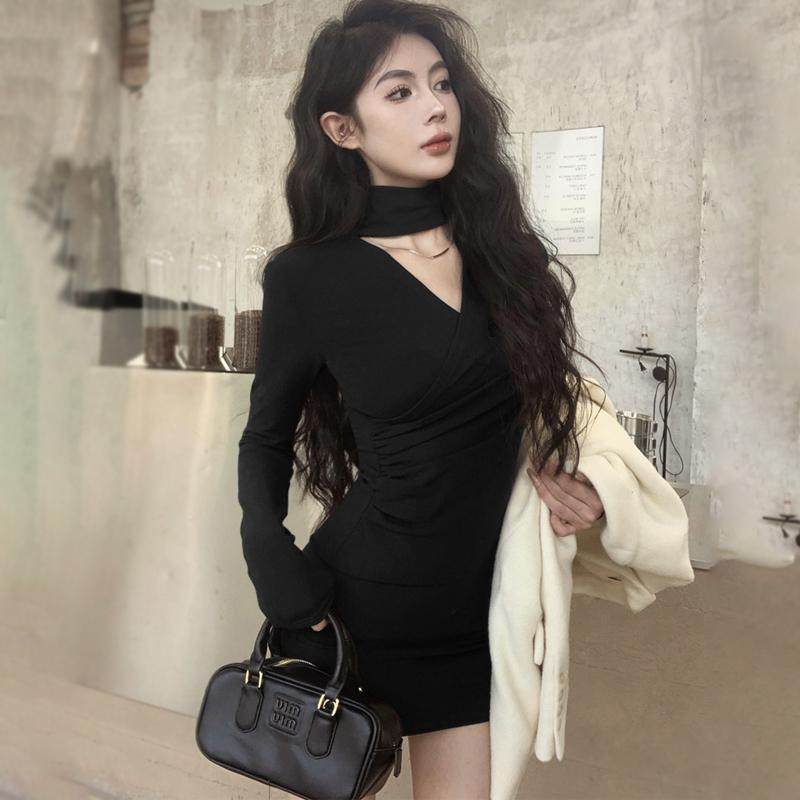 酒红色战袍v领挂脖连衣裙女春秋季修身内搭打底短裙半高领包臀裙