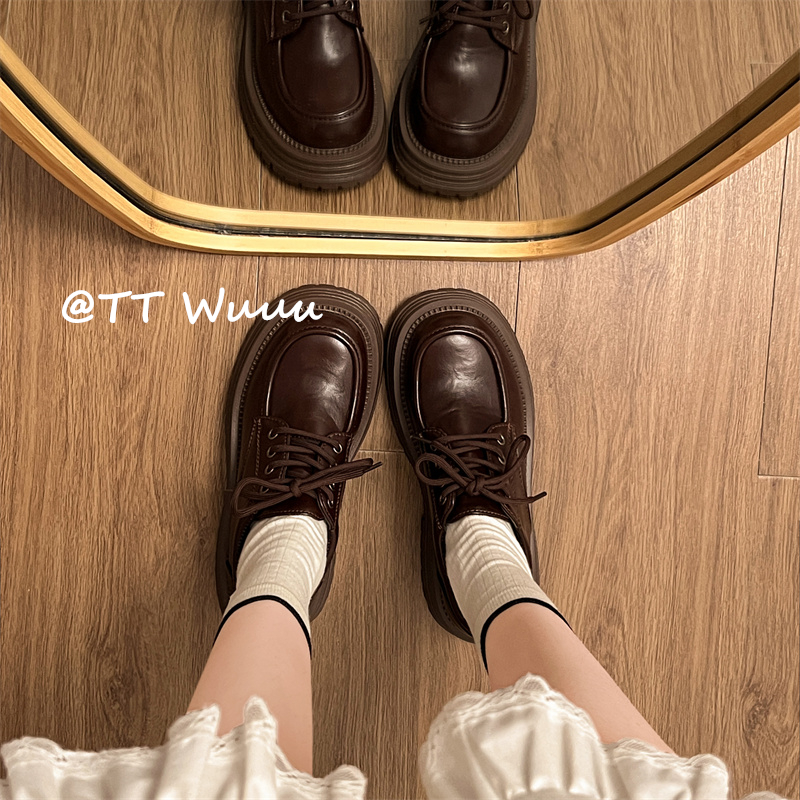 TTWuuu粗跟厚底增高小皮鞋英伦风复古系带百搭乐福鞋小个子单鞋女