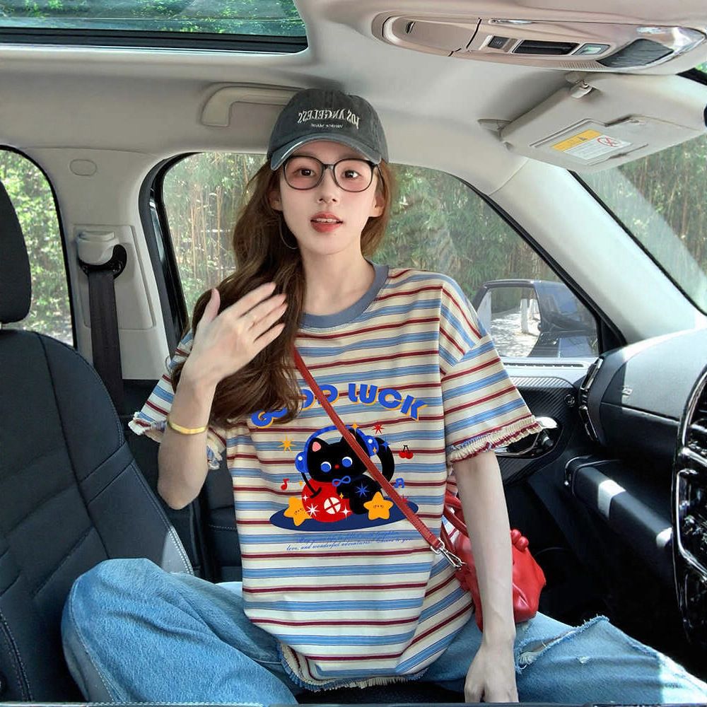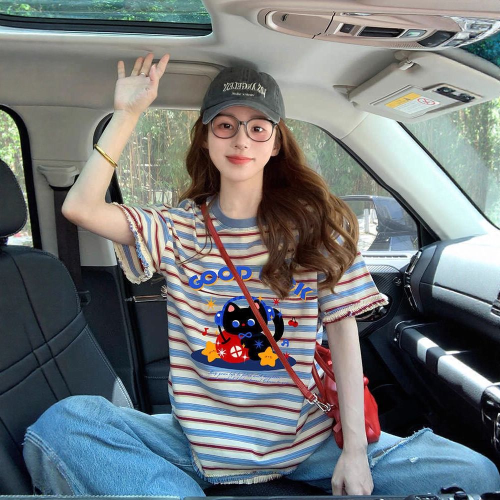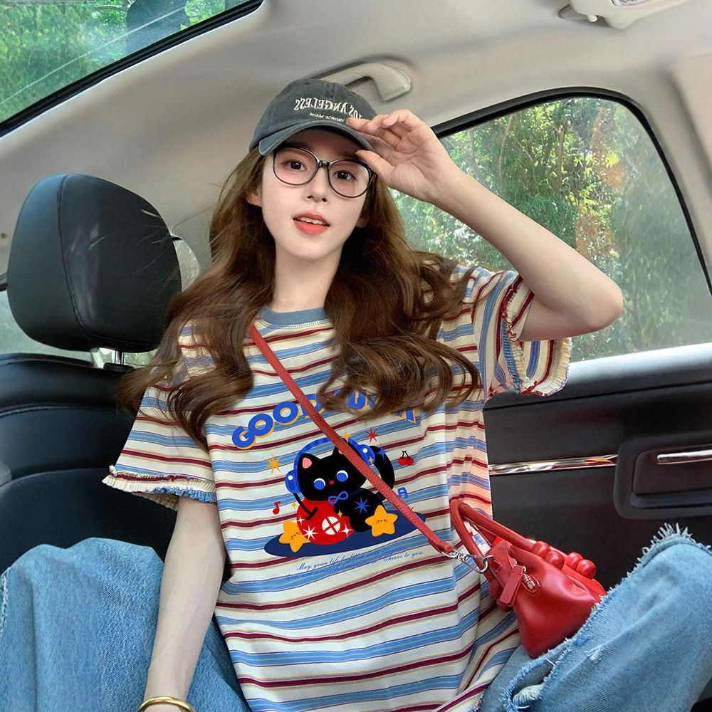 大码女装纯棉花边条纹短袖t恤女夏季新款宽松设计感显瘦遮肚上衣