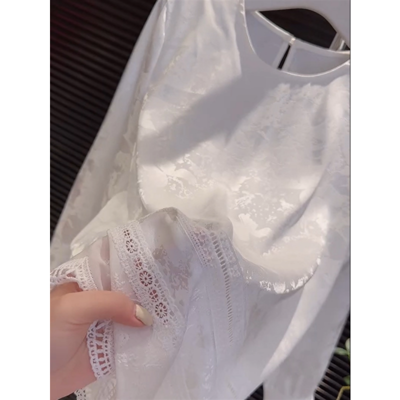 欧货白色蕾丝提花缎面长袖上衣女秋季2025新款宽松百搭显瘦打底衫
