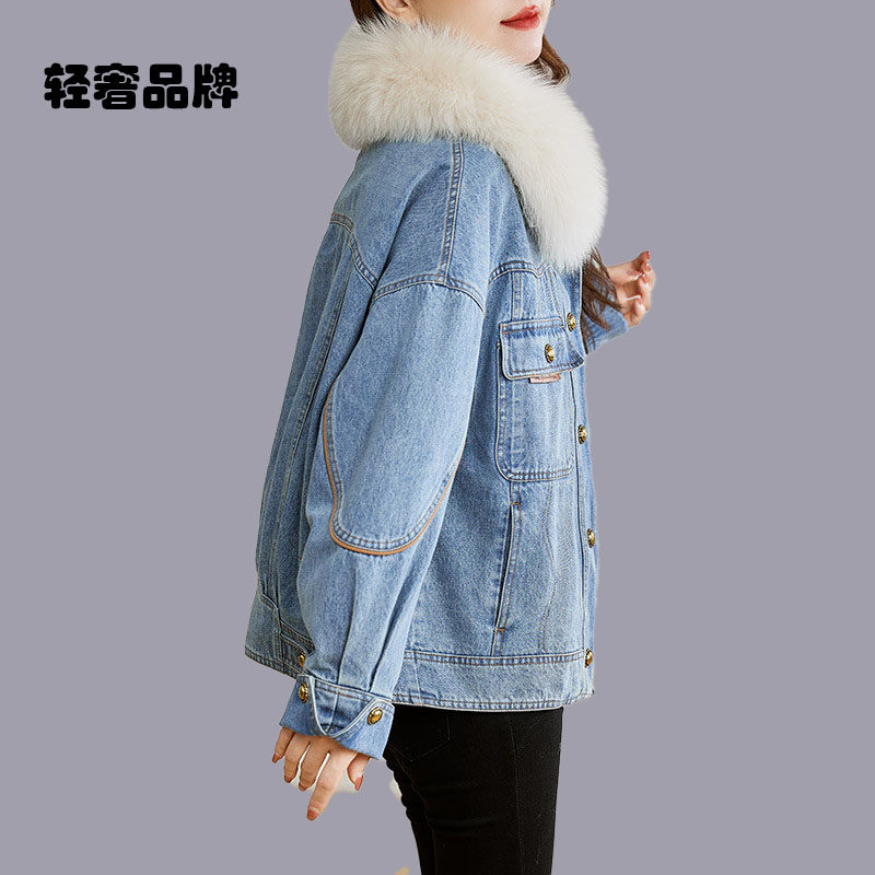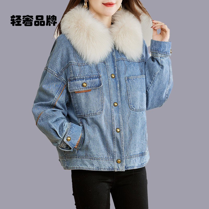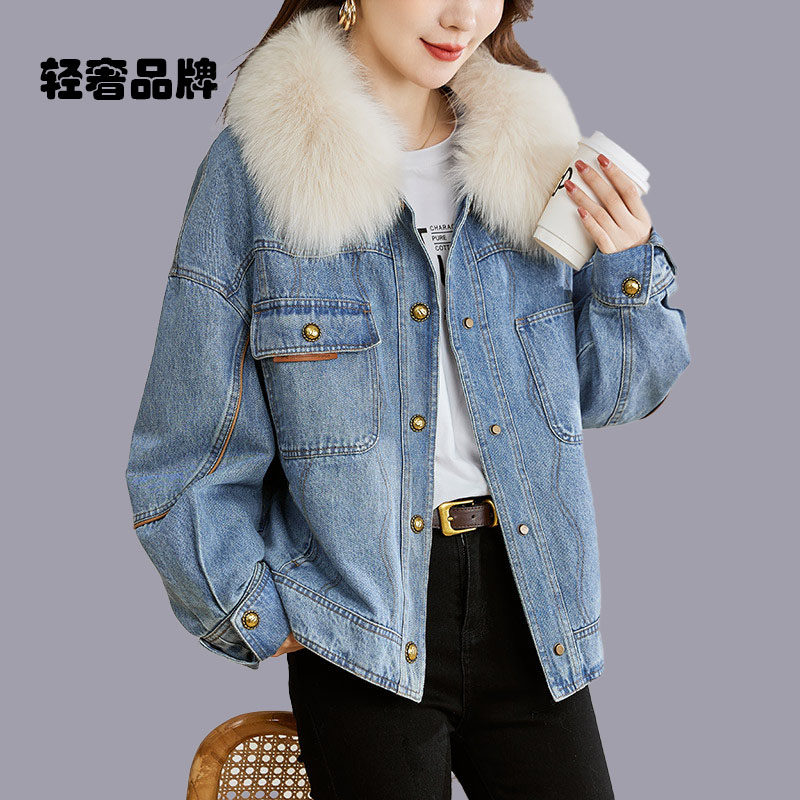 朗姿约定狐狸毛领牛仔派克羽绒服女内胆可拆卸冬装活里活面短外套