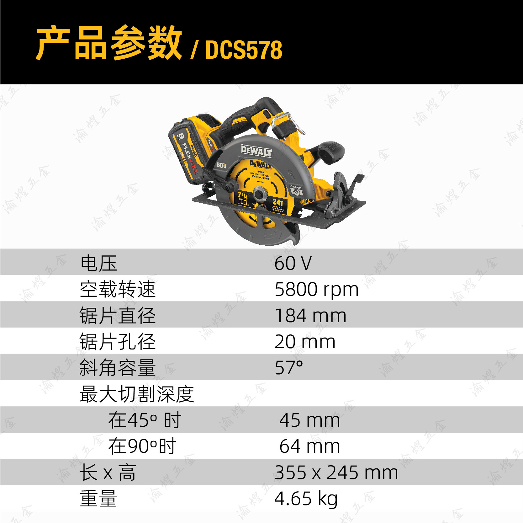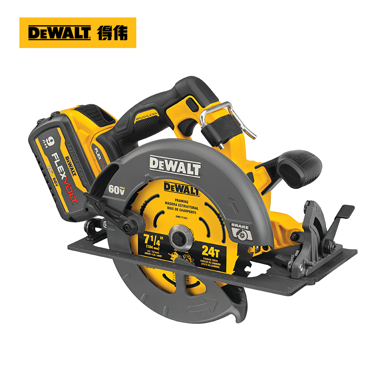 美国得伟60V/54V充电锂电池DCS578电圆锯木工板材切割机7寸电锯
