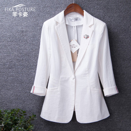 黑色棉麻西装外套女2023春夏新款修身显瘦七分袖薄亚麻小西服上衣