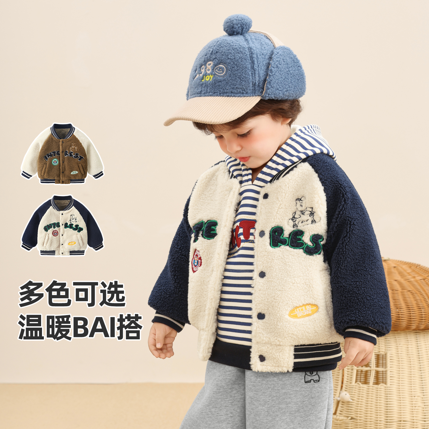 咔咔熊猫宝宝加厚棒球服外套冬装男童女童毛绒棉衣儿童保暖上衣潮