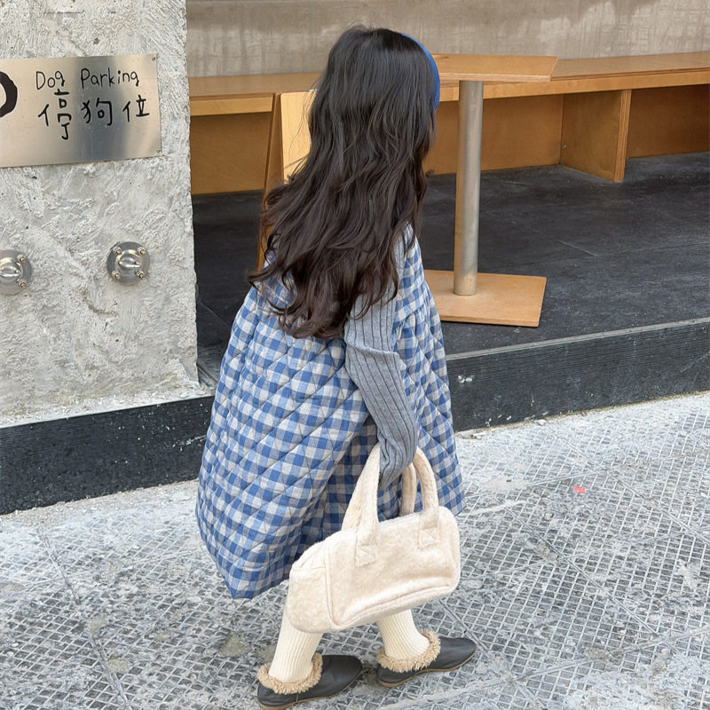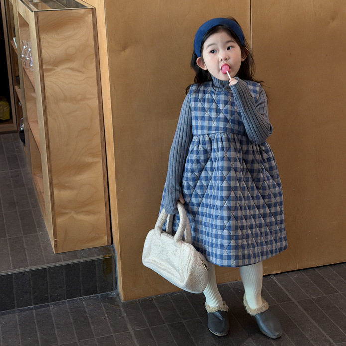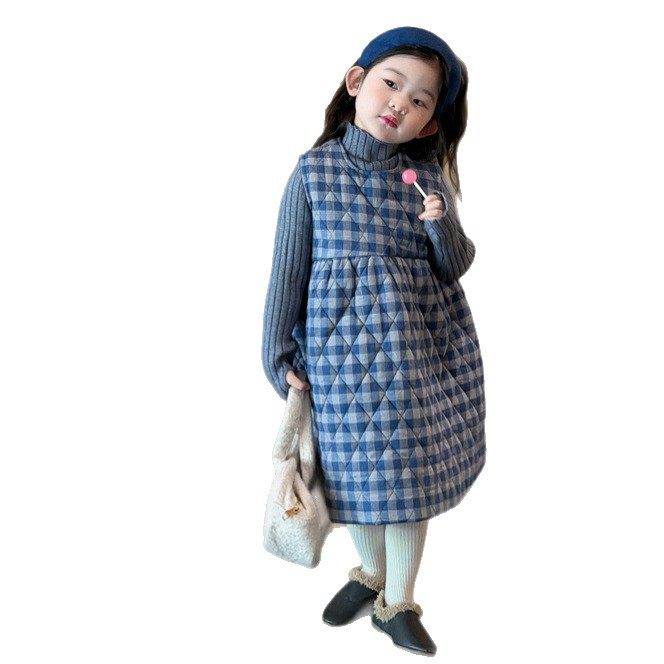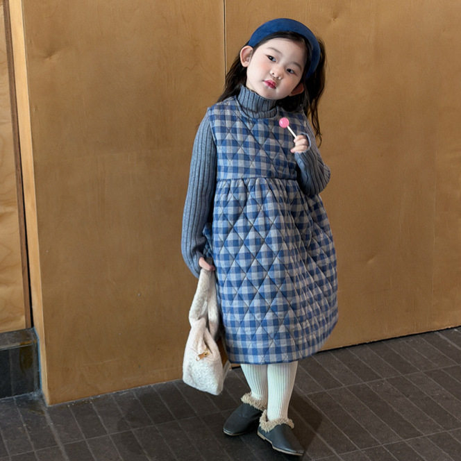 2025冬季新品 韩版童装 女童格子夹棉连衣裙 宝宝背心加厚长裙