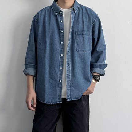 ONUN日系复古水洗工装牛仔衬衫长袖宽松休闲百搭纽扣领衬衣外套秋