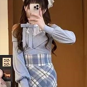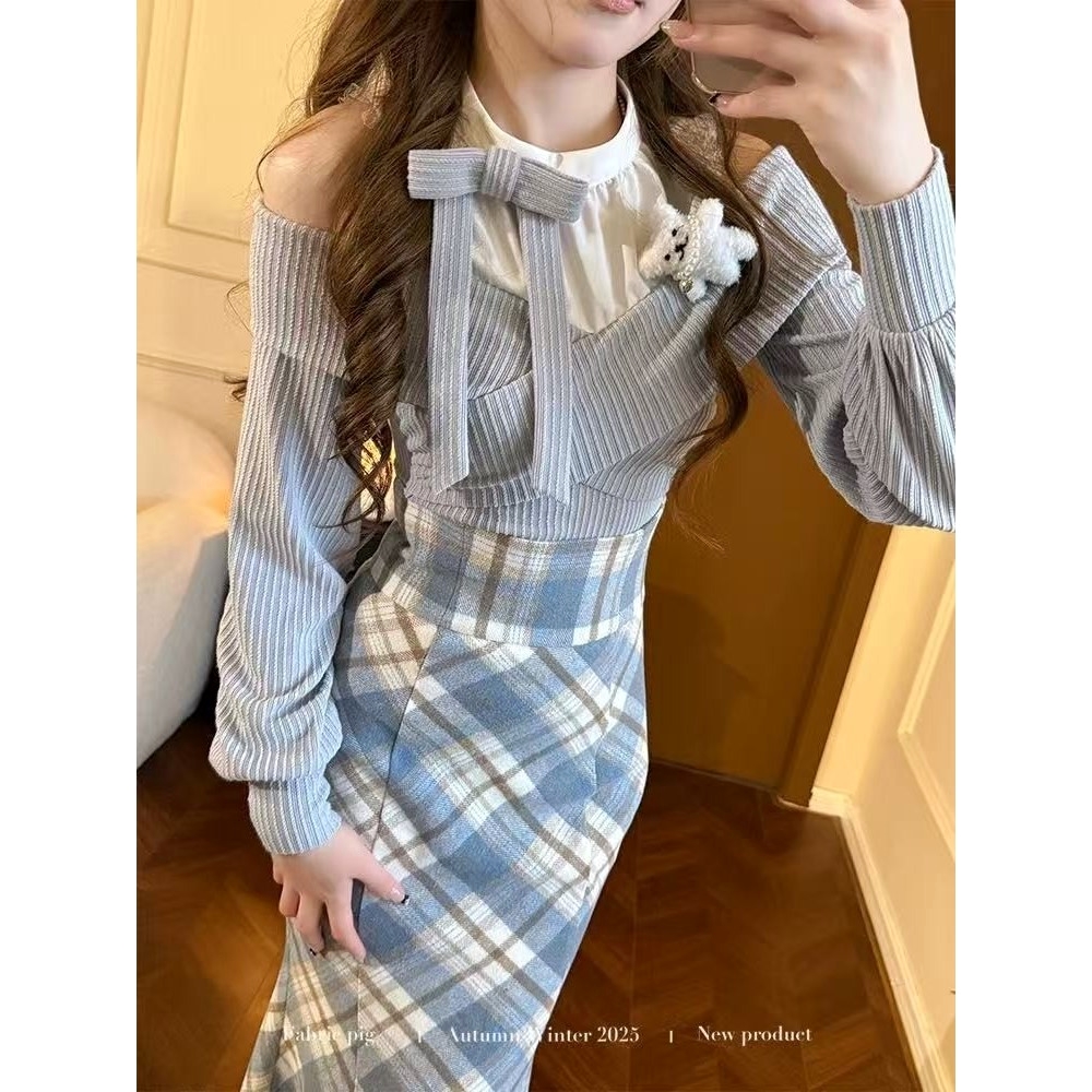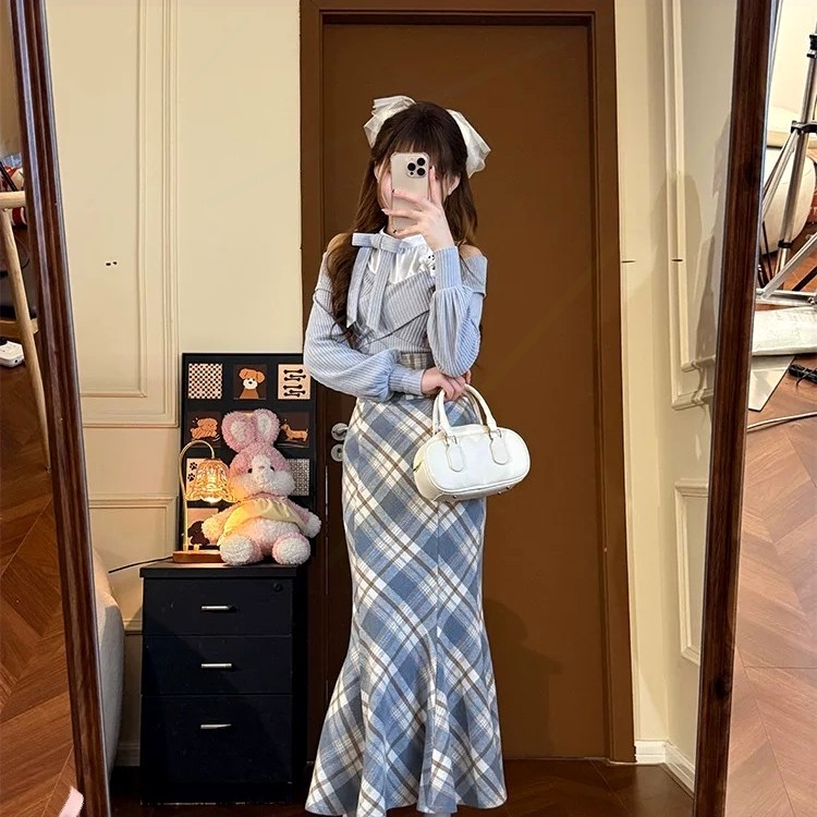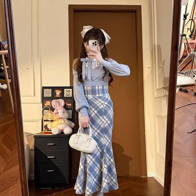 感格纹包臀半身裙女秋装高腰毛呢鱼尾长工作室原创雾蓝小熊 千金