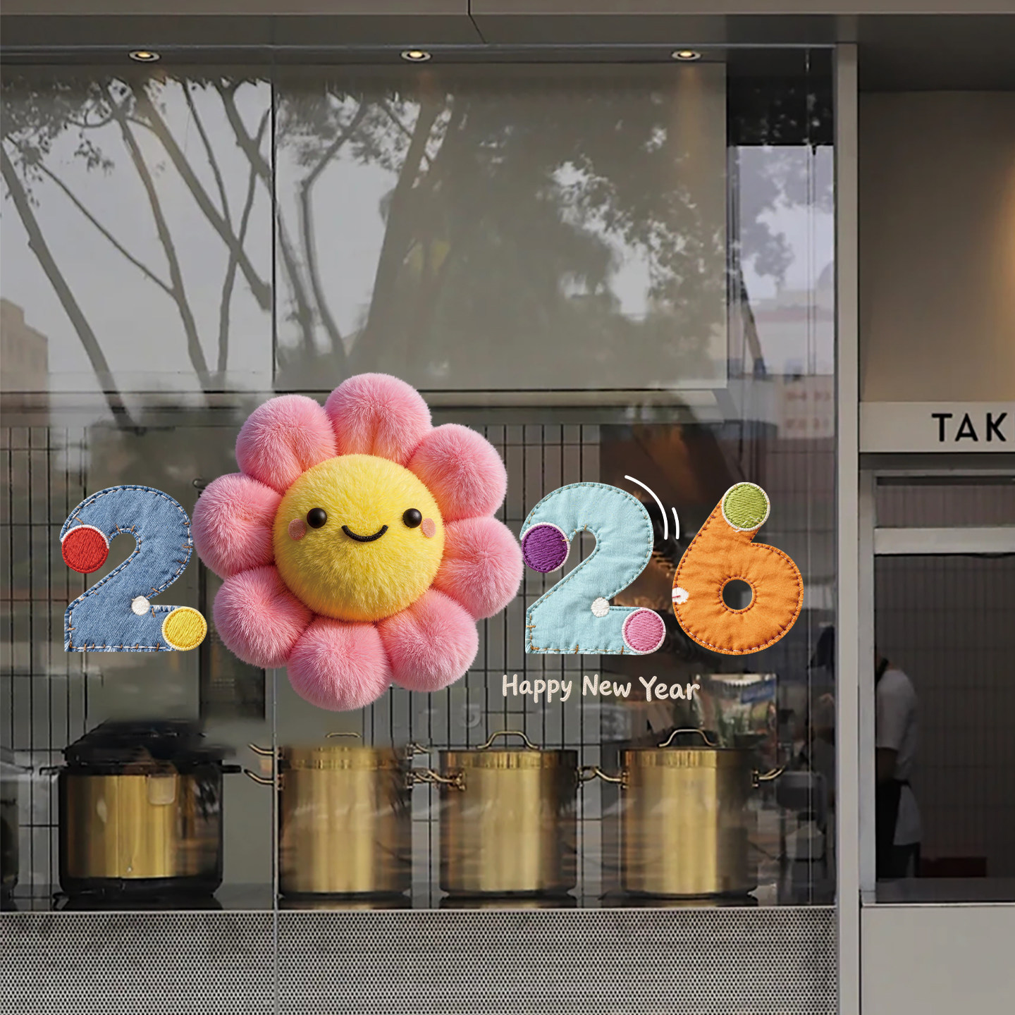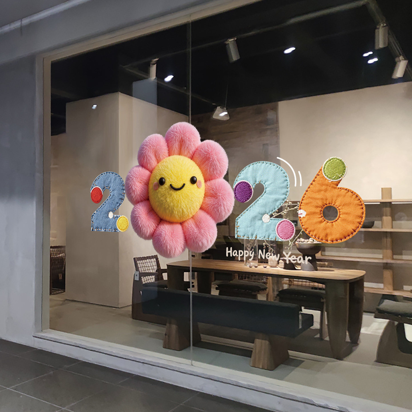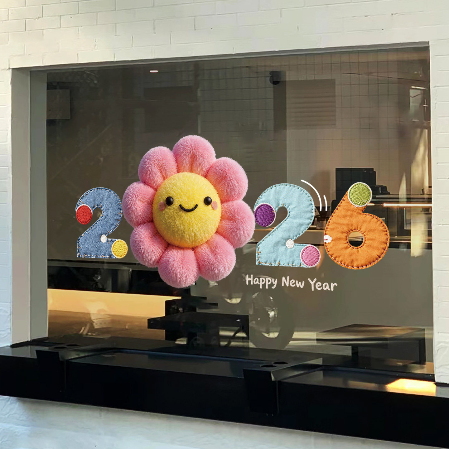 布艺毛绒2026新年玻璃贴橱窗装饰卡通微笑窗花静电贴过年氛围窗贴