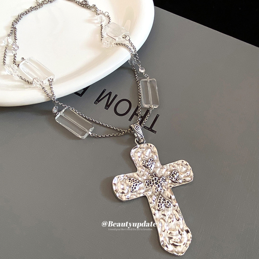 欧美做旧水晶十字架串珠爱心吊坠双层项链锁骨链小众设计感毛衣链