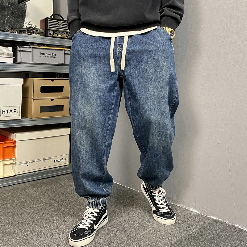 春秋季美式休闲痞帅水洗复古牛仔裤男直筒宽松紧腰哈伦束脚裤子潮