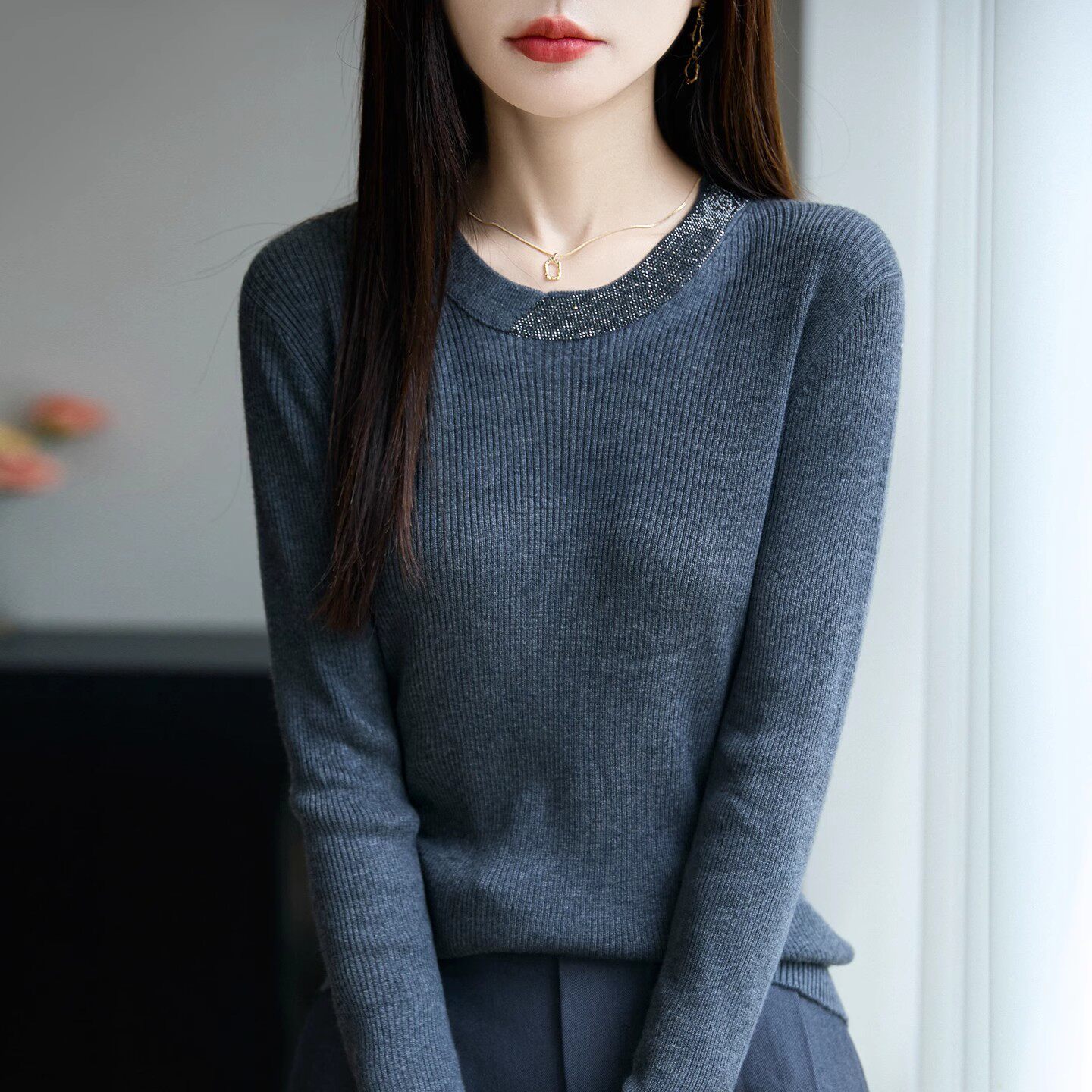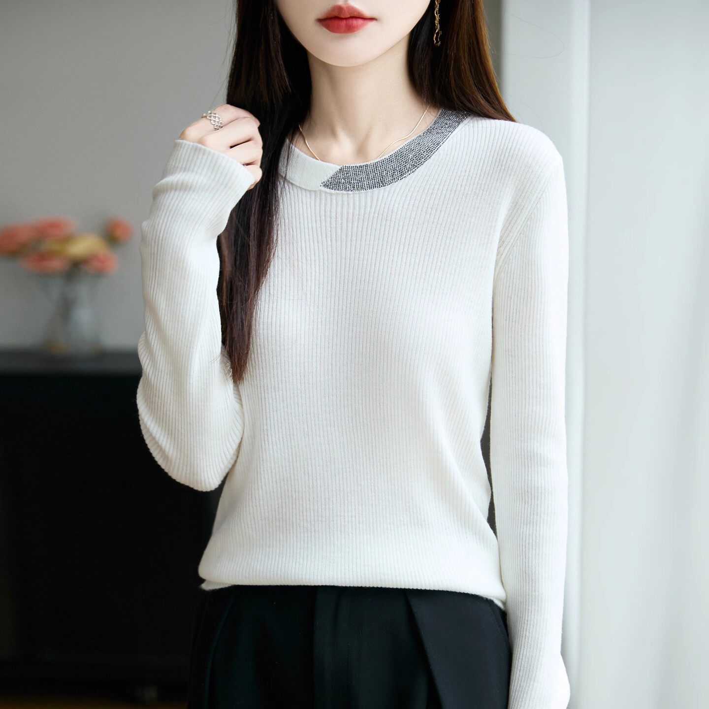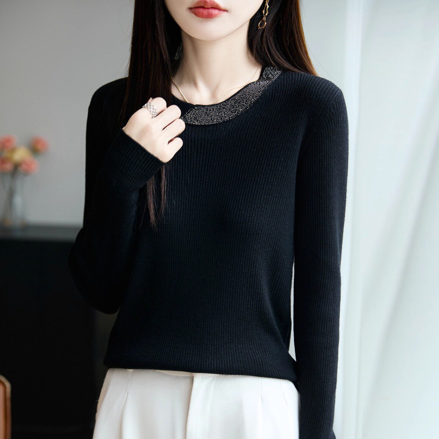 2025秋冬新款时尚百搭圆领长袖针织衫女宽松显瘦毛衣打底上衣