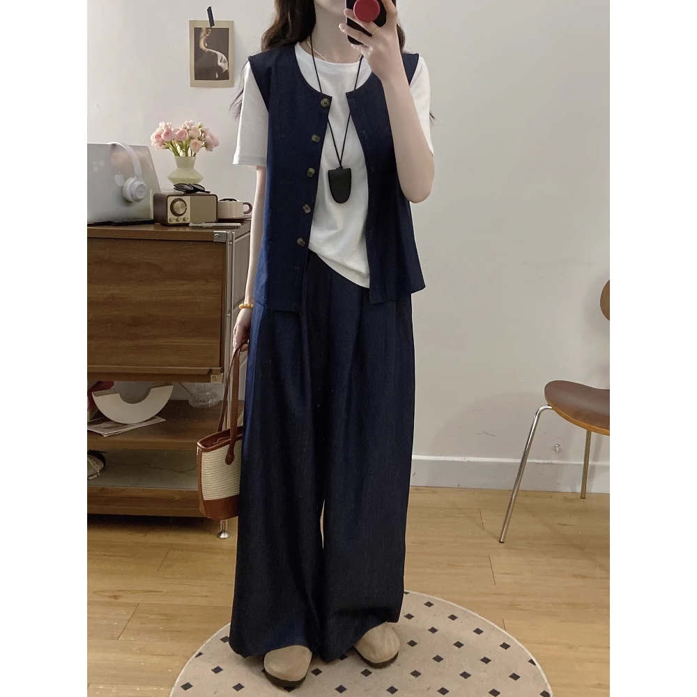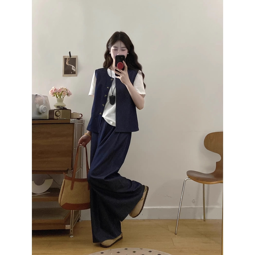 夏装搭配三件套装女大码微胖mm韩系减龄时尚马甲叠穿上衣阔腿裤子