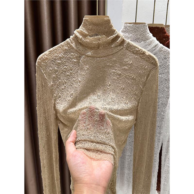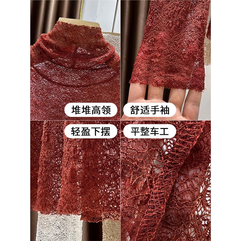 安可拉红堆堆高领蕾丝打底衫女秋冬新款洋气内搭长袖镂空网纱上衣