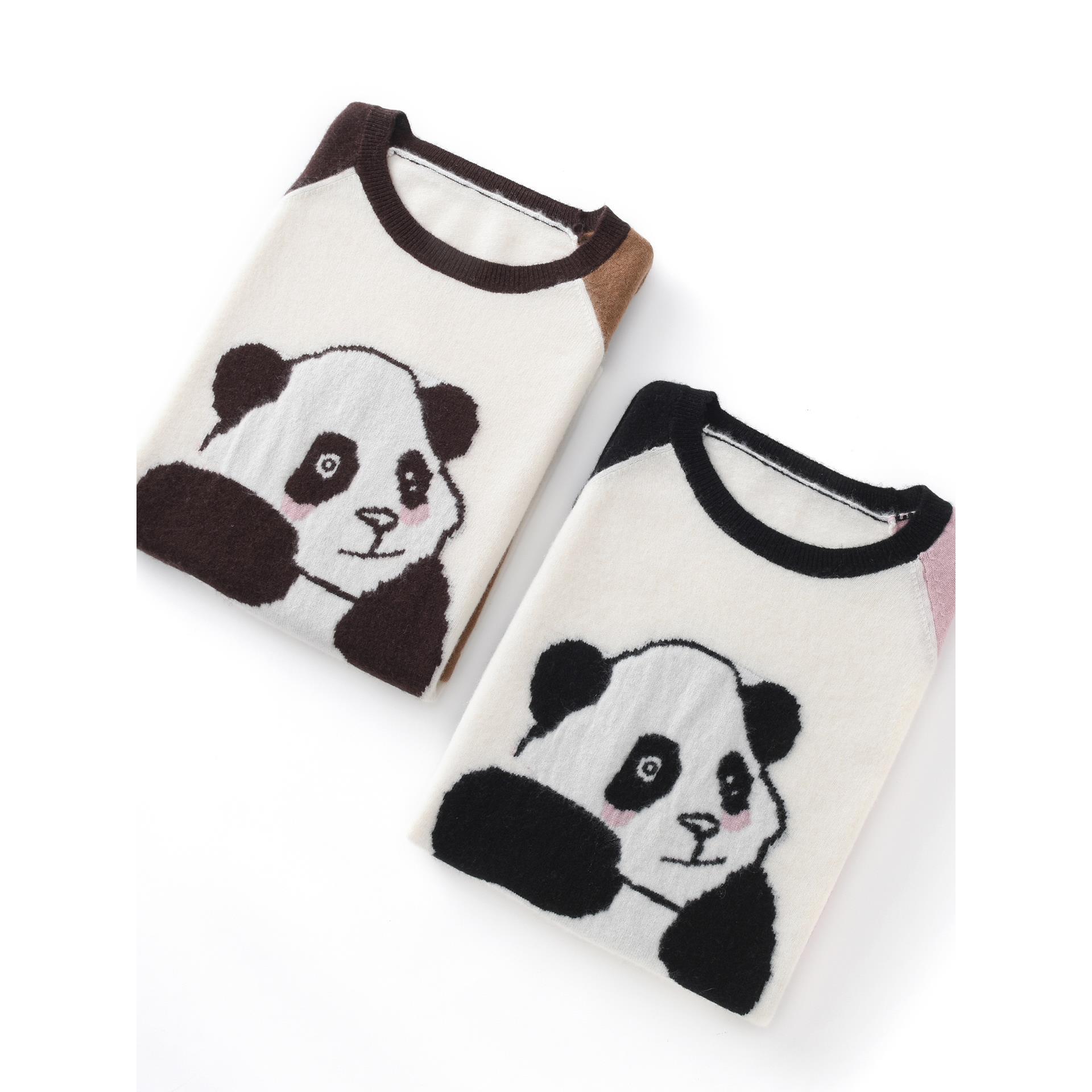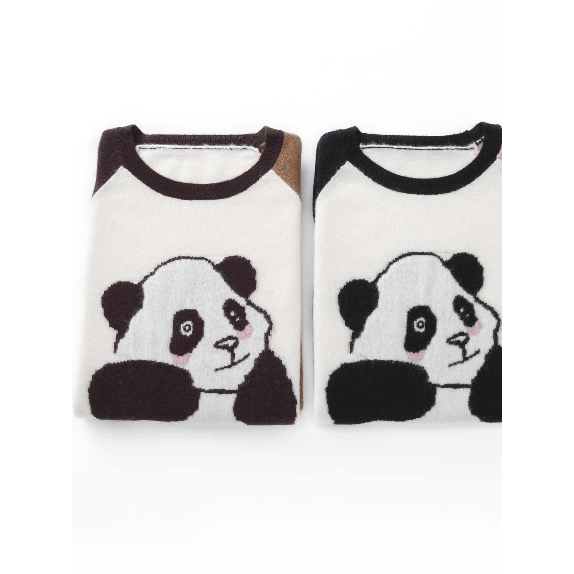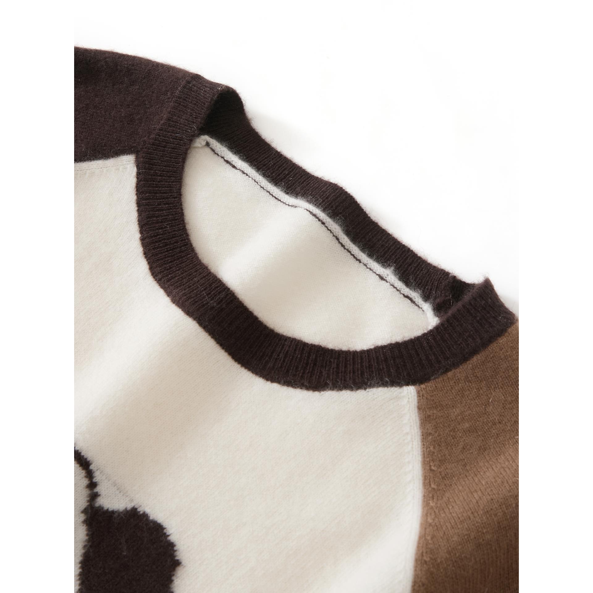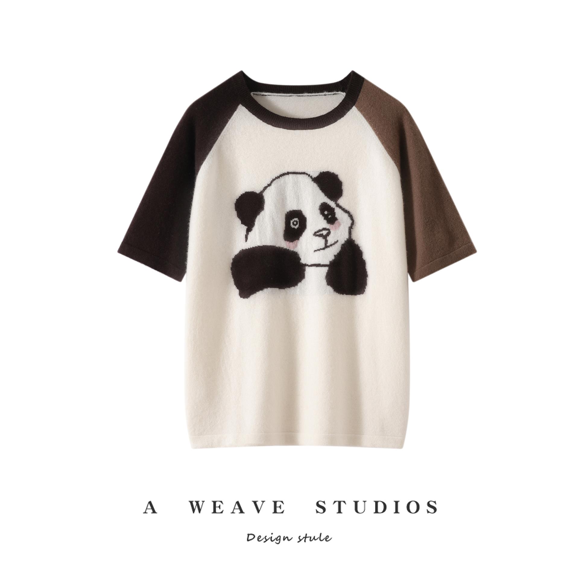 2025新款山羊绒衫女圆领拼色熊猫宽松针织套头毛衣打底短袖上衣