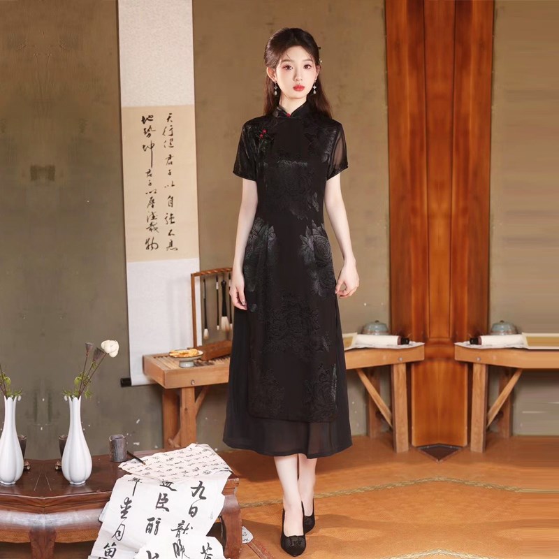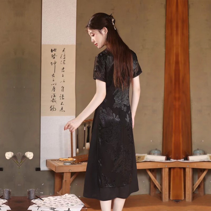 速发黑色旗袍奥黛改良式连衣裙小个子妈妈遮肚子日常年轻夏装高级